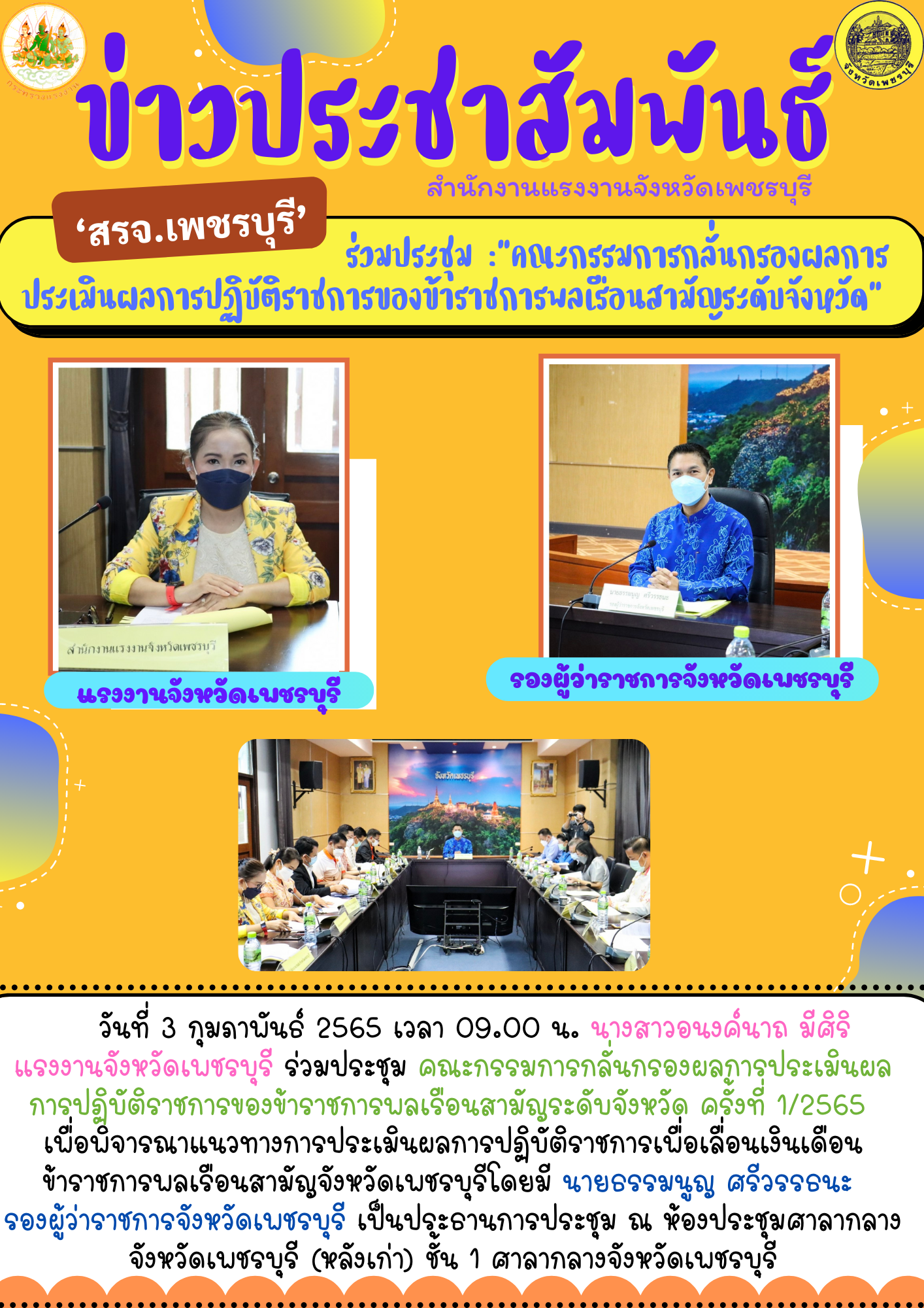 วันที่ 3 กุมภาพันธ์ 2565 เวลา 09.00 น. นางสาวอนงค์นาถ มีศิริ แรงงานจังหวัดเพชรบุรี ร่วมประชุมคณะกรรมการกลั่นกรองผลการประเมินผลการปฏิบัติราชการของข้าราชการพลเรือนสามัญระดับจังหวัด ครั้งที่ 1/2565 เพื่อพิจารณาแนวทางการประเมินผลการปฏิบัติราชการเพื่อเลื่อนเงินเดือนข้าราชการพลเรือสามัญจังหวัดเพชรบุรีโดยมี นายธรรมนูญ ศรีวรรธนะ รองผู้ว่าราชการจังหวัดเพชรบุรี เป็นประธานการประชุม ณ ห้องประชุมศาลากลางจังหวัดเพชรบุรี (หลังเก่า) ชั้น 1 ศาลากลางจังหวัดเพชรบุรี