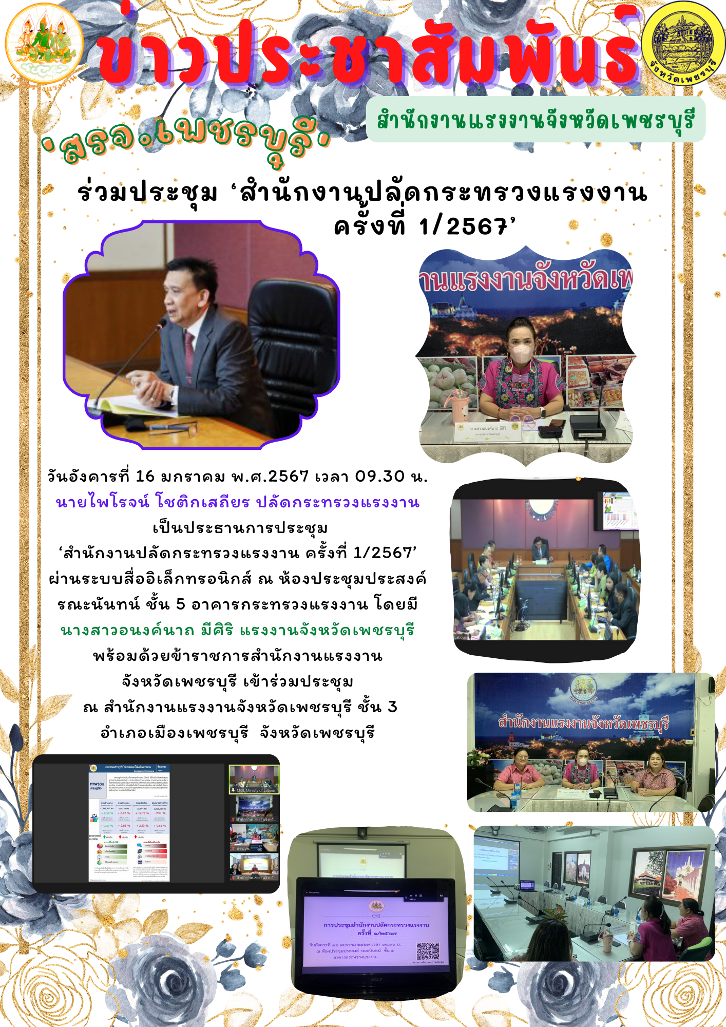 วันอังคารที่ 16 มกราคม พ.ศ.2567 เวลา 09.30 น. นายไพโรจน์ โชติกเสถียร ปลัดกระทรวงแรงงาน เป็นประธานการประชุม ‘สำนักงานปลัดกระทรวงแรงงาน ครั้งที่ 1/2567’ ผ่านระบบสื่ออิเล็กทรอนิกส์ ณ ห้องประชุมประสงค์ รณะนันทน์ ชั้น 5 อาคารกระทรวงแรงงาน โดยมี นางสาวอนงค์นาถ มีศิริ แรงงานจังหวัดเพชรบุรี พร้อมด้วยข้าราชการสำนักงานแรงงานจังหวัดเพชรบุรี เข้าร่วมประชุม ณ สำนักงานแรงงานจังหวัดเพชรบุรี ชั้น 3 อำเภอเมืองเพชรบุรี จังหวัดเพชรบุรี