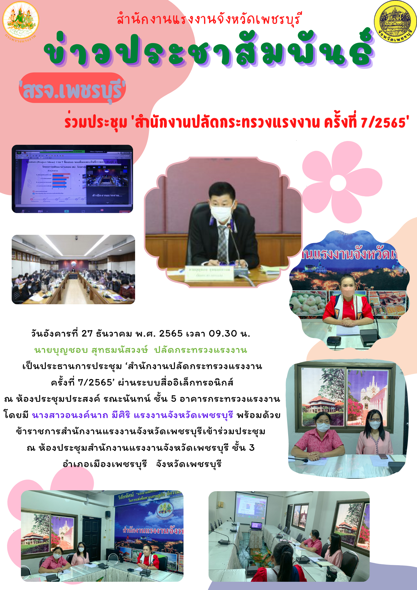 วันอังคารที่ 27 ธันวาคม พ.ศ. 2565 เวลา 09.30 น. นายบุญชอบ สุทธมนัสวงษ์ ปลัดกระทรวงแรงงาน เป็นประธานการประชุม ‘สำนักงานปลัดกระทรวงแรงงาน ครั้งที่ 7/2565’ ผ่านระบบสื่ออิเล็กทรอนิกส์ ณ ห้องประชุมประสงค์ รณะนันทน์ ชั้น 5 อาคารกระทรวงแรงงาน โดยมี นางสาวอนงค์นาถ มีศิริ แรงงานจังหวัดเพชรบุรี พร้อมด้วยเจ้าหน้าที่เข้าร่วมประชุม ณ ห้องประชุมสำนักงานแรงงานจังหวัดเพชรบุรี ชั้น 3 อำเภอเมืองเพชรบุรี จังหวัดเพชรบุรี