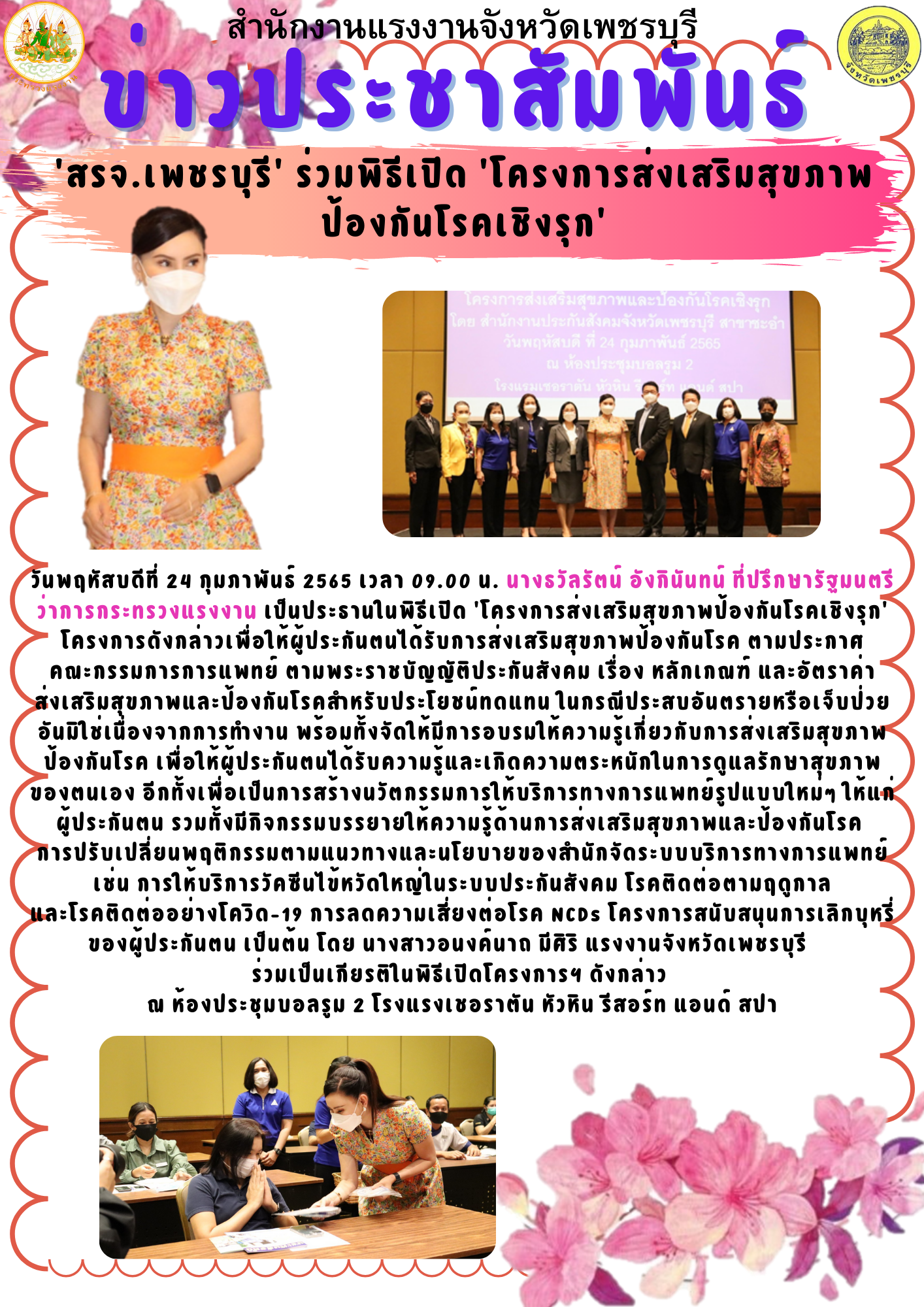 วันพฤหัสบดีที่ 24 กุมภาพันธ์ 2565 เวลา 09.00 น. นางธวัลรัตน์ อังกินันทน์ ที่ปรึกษารัฐมนตรีว่าการกระทรวงแรงงาน เป็นประธานในพิธีเปิด ‘โครงการส่งเสริมสุขภาพป้องกันโรคเชิงรุก’ โครงการดังกล่าวเพื่อให้ผู้ประกันตนได้รับการส่งเสริมสุขภาพป้องกันโรค ตามประกาศคณะกรรมการการแพทย์ ตามพระราชบัญญัติประกันสังคม เรื่อง หลักเกณฑ์ และอัตราค่าส่งเสริมสุขภาพและป้องกันโรคสำหรับประโยชน์ทดแทน ในกรณีประสบอันตรายหรือเจ็บป่วยอันมิใช่เนื่องจากการทำงาน พร้อมทั้งจัดให้มีการอบรมให้ความรู้เกี่ยวกับการส่งเสริมสุขภาพป้องกันโรค เพื่อให้ผู้ประกันตนได้รับความรู้และเกิดความตระหนักในการดูแลรักษาสุขภาพของตนเอง อีกทั้งเพื่อเป็นการสร้างนวัตกรรมการให้บริการทางการแพทย์รูปแบบใหม่ๆ ให้แก่ผู้ประกันตน รวมทั้งมีกิจกรรมบรรยายให้ความรู้ด้านการส่งเสริมสุขภาพและป้องกันโรค การปรับเปลี่ยนพฤติกรรมตามแนวทางและนโยบายของสำนักจัดระบบบริการทางการแพทย์ เช่น การให้บริการวัคซีนไข้หวัดใหญ่ในระบบประกันสังคม โรคติดต่อตามฤดูกาลและโรคติดต่ออย่างโควิด-19 การลดความเสี่ยงต่อโรค NCDs โครงการสนับสนุนการเลิกบุหรี่ของผู้ประกันตน เป็นต้น โดย นางสาวอนงค์นาถ มีศิริ แรงงานจังหวัดเพชรบุรี ร่วมเป็นเกียรติในพิธีเปิดโครงการฯ ดังกล่าว ณ ห้องประชุมบอลรูม 2 โรงแรงเชอราตัน หัวหิน รีสอร์ท แอนด์ สปา