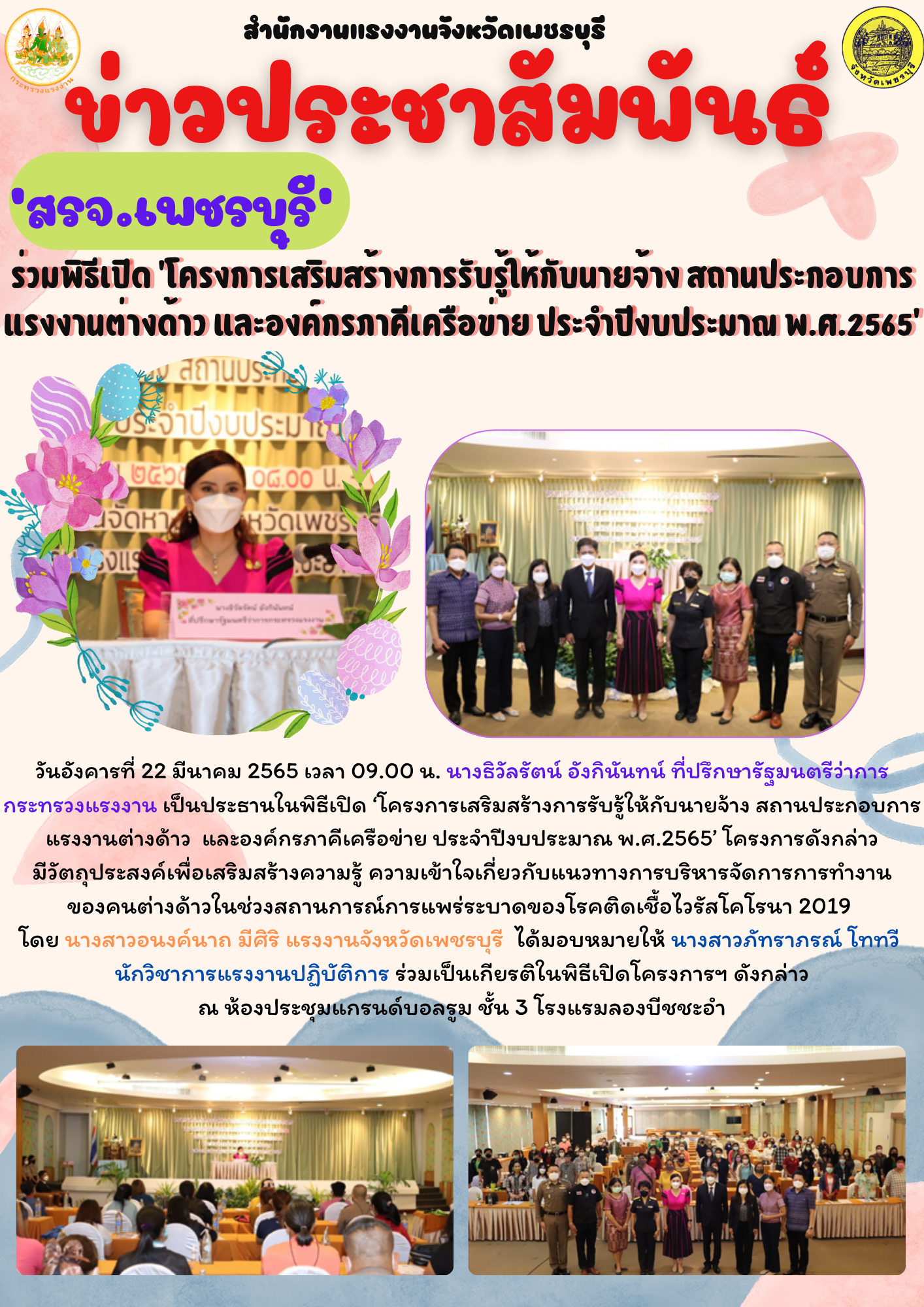วันอังคารที่ 22 มีนาคม 2565 เวลา 09.00 น. นางธิวัลรัตน์ อังกินันทน์ ที่ปรึกษารัฐมนตรีว่าการกระทรวงแรงงาน เป็นประธานในพิธีเปิด ‘โครงการเสริมสร้างการรับรู้ให้กับนายจ้าง สถานประกอบการ แรงงานต่างด้าว และองค์กรภาคีเครือข่าย ประจำปีงบประมาณ พ.ศ.2565’ โครงการดังกล่าวมีวัตถุประสงค์เพื่อเสริมสร้างความรู้ ความเข้าใจเกี่ยวกับแนวทางการบริหารจัดการการทำงานของคนต่างด้าวในช่วงสถานการณ์ การแพร่ระบาดของโรคติดเชื้อไวรัสโคโรนา 2019 โดย นางสาวอนงค์นาถ มีศิริ แรงงานจังหวัดเพชรบุรี ได้มอบหมายให้ นางสาวภัทราภรณ์ โททวี นักวิชาการแรงงานปฏิบัติการ ร่วมเป็นเกียรติในพิธีเปิดโครงการฯ ดังกล่าว ณ ห้องประชุมแกรนด์บอลรูม ชั้น 3 โรงแรมลองบีชชะอำ