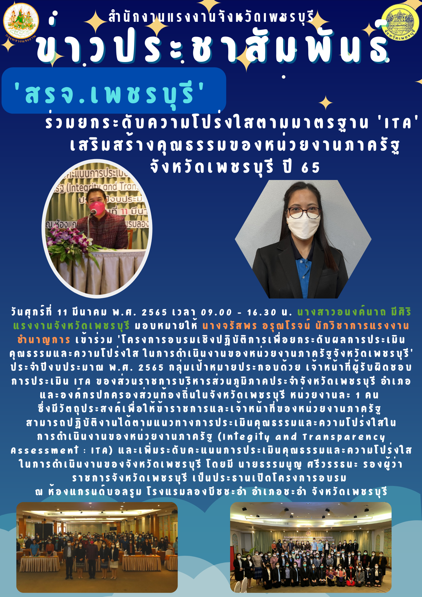 วันศุกร์ที่ 11 มีนาคม พ.ศ. 2565 เวลา 09.00 – 16.30 น. นางสาวอนงค์นาถ มีศิริ แรงงานจังหวัดเพชรบุรี มอบหมายให้ นางจรัสพร อรุณโรจน์ นักวิชาการแรงงานชำนาญการ เข้าร่วม ‘โครงการอบรมเชิงปฏิบัติการเพื่อยกระดับผลการประเมินคุณธรรมและความโปร่งใสในการดำเนินงานของหน่วยงานภาครัฐจังหวัดเพชรบุรี’ ประจำปีงบประมาณ พ.ศ. 2565 กลุ่มเป้าหมายประกอบด้วย เจ้าหน้าที่ผู้รับผิดชอบการประเมิน ITA ของส่วนราชการบริหารส่วนภูมิภาคประจำจังหวัดเพชรบุรี อำเภอ และองค์กรปกครองส่วนท้องถิ่นในจังหวัดเพชรบุรี หน่วยงานละ 1 คน ซึ่งมีวัตถุประสงค์เพื่อให้ข้าราชการและเจ้าหน้าที่ของหน่วยงานภาครัฐ สามารถปฏิบัติงานได้ตามแนวทางการประเมินคุณธรรมและความโปร่งใสในการดำเนินงานของหน่วยงานภาครัฐ (Integity and Transparency Assessment : ITA) และเพิ่มระดับคะแนนการประเมินคุณธรรมและความโปร่งใสในการดำเนินงานของจังหวัดเพชรบุรี โดยมี นายธรรมนูญ ศรีวรรธนะ รองผู้ว่าราชการจังหวัดเพชรบุรี เป็นประธานเปิดโครงการอบรม ณ ห้องแกรนด์บอลรูม โรงแรมลองบีชชะอำ อำเภอชะอำ จังหวัดเพชรบุรี
