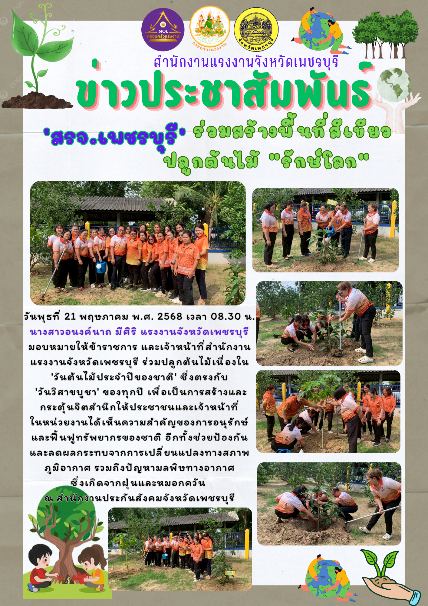 วันพุธที่ 21 พฤษภาคม พ.ศ. 2568 เวลา 08.30 น. นางสาวอนงค์นาถ มีศิริ แรงงานจังหวัดเพชรบุรี มอบหมายให้ข้าราชการ และเจ้าหน้าที่สำนักงานแรงงานจังหวัดเพชรบุรี ร่วมปลูกต้นไม้เนื่องใน ‘วันต้นไม้ประจำปีของชาติ’ ซึ่งตรงกับ ‘วันวิสาขบูชา’ ของทุกปี เพื่อเป็นการสร้างและกระตุ้นจิตสำนึกให้ประชาชน และเจ้าหน้าที่ในหน่วยงานได้เห็นความสำคัญ ของการอนุรักษ์และฟื้นฟูทรัพยากรของชาติ อีกทั้งช่วยป้องกันและลดผลกระทบจากการเปลี่ยนแปลงทางสภาพ ภูมิอากาศ รวมถึงปัญหามลพิษทางอากาศซึ่งเกิดจากฝุ่นและหมอกควัน ณ สำนักงานประกันสังคมจังหวัดเพชรบุรี