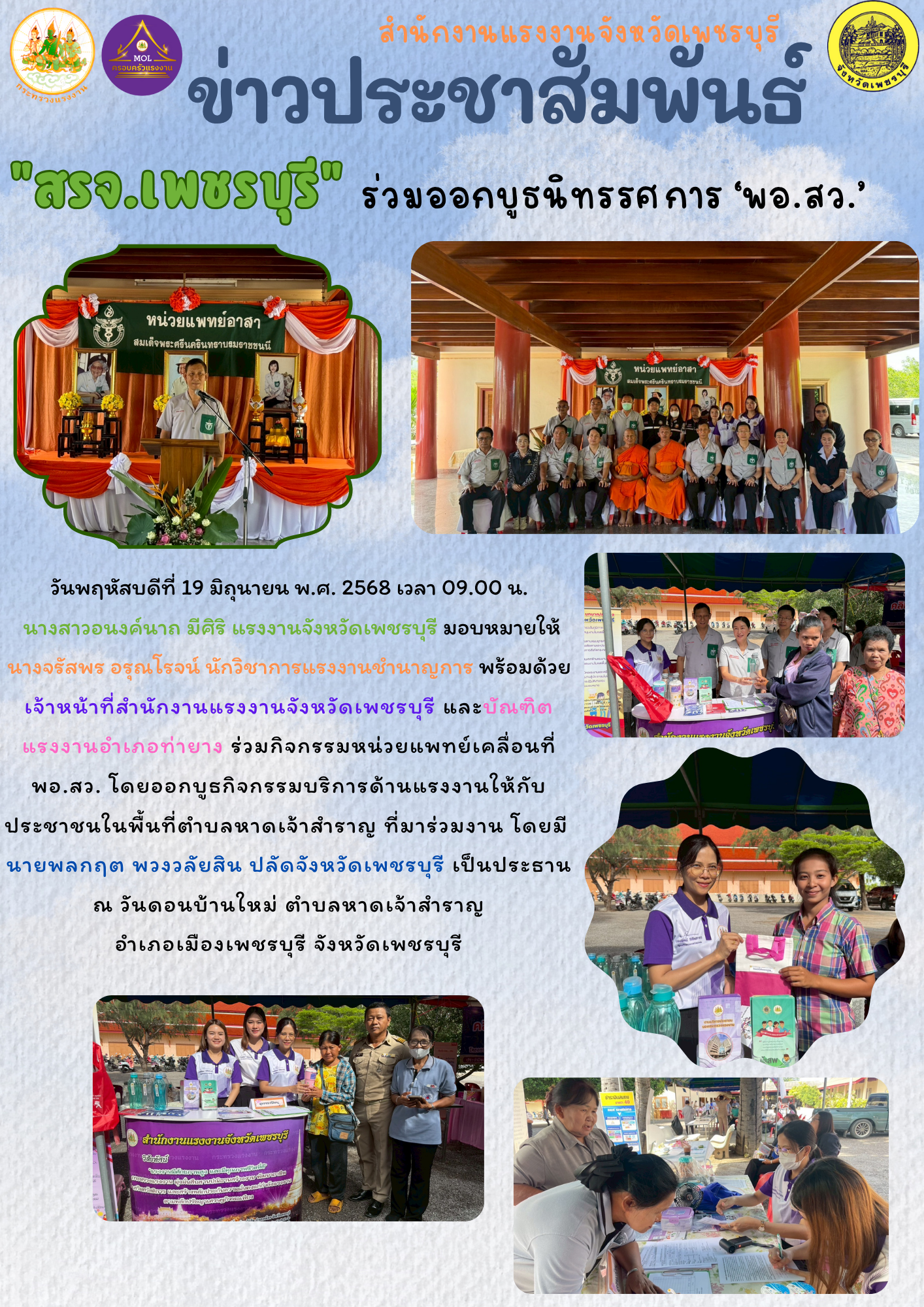 วันพฤหัสบดีที่ 19 มิถุนายน พ.ศ. 2568 เวลา 09.00 น. นางสาวอนงค์นาถ มีศิริ แรงงานจังหวัดเพชรบุรี มอบหมายให้ นางจรัสพร อรุณโรจน์ นักวิชาการแรงงานชำนาญการ พร้อมด้วย เจ้าหน้าที่สำนักงานแรงงานจังหวัดเพชรบุรี และบัณฑิตแรงงานอำเภอท่ายาง ร่วมกิจกรรมหน่วยแพทย์เคลื่อนที่ พอ.สว. โดยออกบูธกิจกรรมบริการด้านแรงงานให้กับประชาชนในพื้นที่ตำบลหาดเจ้าสำราญ ที่มาร่วมงาน โดยมี นายพลกฤต พวงวลัยสิน ปลัดจังหวัดเพชรบุรี เป็นประธาน ณ วันดอนบ้านใหม่ ตำบลหาดเจ้าสำราญ อำเภอเมืองเพชรบุรี จังหวัดเพชรบุรี