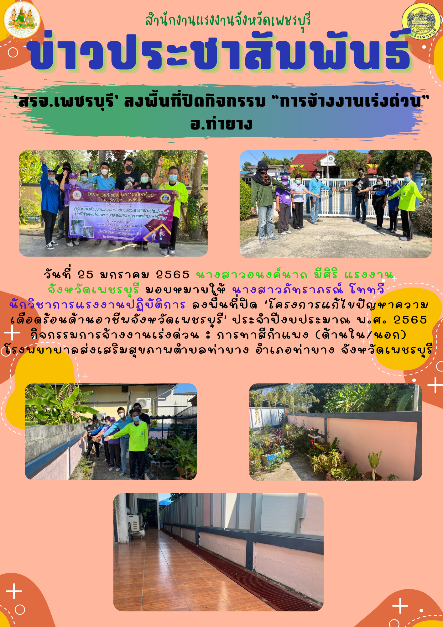 วันที่ 25 มกราคม 2565 นางสาวอนงค์นาถ มีศิริ แรงงานจังหวัดเพชรบุรี มอบหมายให้ นางสาวภัทราภรณ์ โททวี นักวิชาการแรงงานปฏิบัติการ ลงพื้นที่ปิด ‘โครงการแก้ไขปัญหาความเดือดร้อนด้านอาชีพจังหวัดเพชรบุรี’ ประจำปีงบประมาณ พ.ศ. 2565 กิจกรรมการจ้างงานเร่งด่วน : การทาสีกำแพง (ด้านใน/นอก) โรงพยาบาลส่งเสริมสุขภาพตำบลท่ายาง อำเภอท่ายาง จังหวัดเพชรบุรี