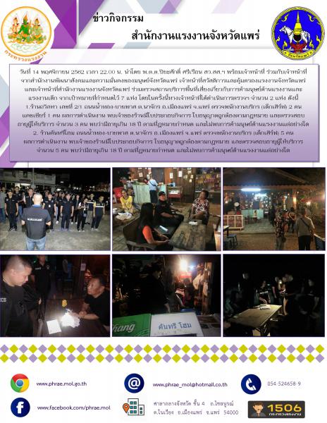 วันที่ 14 พฤศจิกายน 2562 เวลา 22.00 น. นำโดย พ.ต.ต.ปิยะศักดิ์ ศรีเรือน สว.สส.ฯ พร้อมเจ้าหน้าที่ ร่วมกับเจ้าหน้าที่จากสำนักงานพัฒนาสังคมและความมั่นคงของมนุษย์จังหวัดแพร่ เจ้าหน้าที่สวัสดิการและคุ้มครองแรงงานจังหวัดแพร่และเจ้าหน้าที่สำนักงานแรงงานจังหวัดแพร่ ร่วมตรวจสถานบริการพื้นที่เสี่ยงเกี่ยวกับการค้ามนุษย์ด้านแรงงานและแรงงานเด็ก จากเป้าหมายที่กำหนดไว้ 7 แห่ง โดยในครั้งนี้ทางเจ้าหน้าที่ได้ดำเนินการตรวจฯ จำนวน 2 แห่ง ดังนี้ 1.ร้านถวิลหา เลขที่ 2/1 ถนนน้ำทอง-บายพาส ต.นาจักร อ.เมืองแพร่ จ.แพร่ ตรวจพนักงานบริกร (เด็กเสิร์ฟ) 2 คน แคชเชียร์ 1 คน ผลการดำเนินงาน พบเจ้าของร้านมีใบประกอบกิจการ ใบอนุญาตถูกต้องตามกฎหมาย และตรวจสอบ อายุผู้ให้บริการ จำนวน 3 คน พบว่ามีอายุเกิน 18 ปี ตามที่ฎหมายกำหนด และไม่พบการค้ามนุษย์ด้านแรงงานแต่อย่างใด 2. ร้านคันทรีโฮม ถนนน้ำทอง-บายพาส ต.นาจักร อ.เมืองแพร่ จ.แพร่ ตรวจพนักงานบริกร (เด็กเสิร์ฟ) 5 คน ผลการดำเนินงาน พบเจ้าของร้านมีใบประกอบกิจการ ใบอนุญาตถูกต้องตามกฎหมาย และตรวจสอบอายุผู้ให้บริการ จำนวน 5 คน พบว่ามีอายุเกิน 18 ปี ตามที่ฎหมายกำหนด และไม่พบการค้ามนุษย์ด้านแรงงานแต่อย่างใด