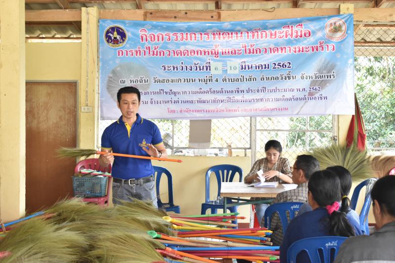 เมื่อวันที่ 10 มีนาคม 2562 นางสาวปราณี ชลารักษ์ แรงงานจังหวัดแพร่มอบหมายให้ข้าราชการและเจ้าหน้าที่สำนักงานแรงงานจังหวัดแพร่ ลงพื้นที่ปิดโครงการแก้ไขปัญหาความเดือดร้อนด้านอาชีพ จังหวัดแพร่ ประจำปีงบประมาณ พ.ศ.2562 หลักสูตรการพัฒนาทักษะฝีมือการทำไม้กวาดดอกหญ้าและไม้กวาดทางมะพร้าว ณ หอฉัน วัดสองแควบน ม.4 ต.ป่าสัก อ.วังชิ้น จ.แพร่
