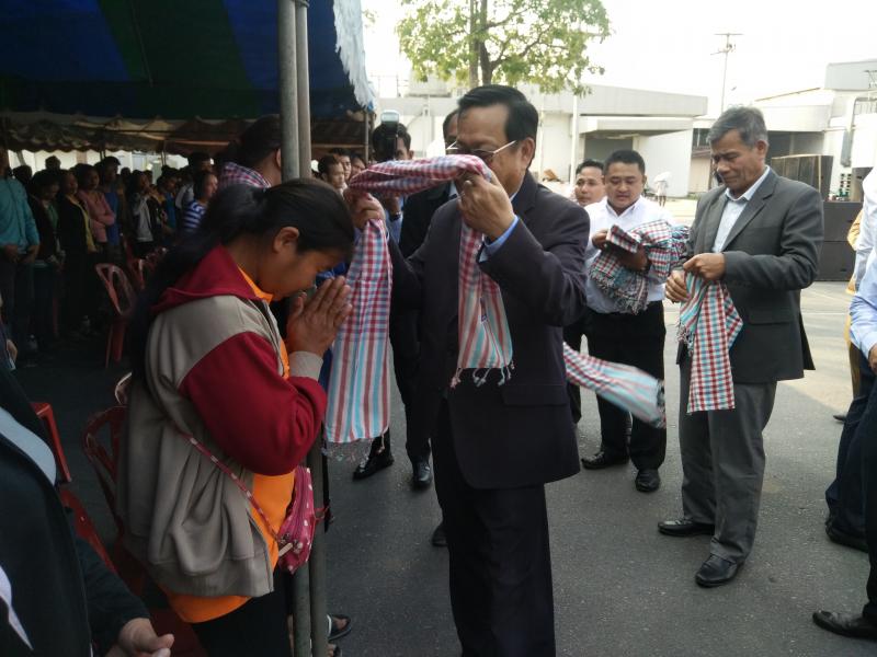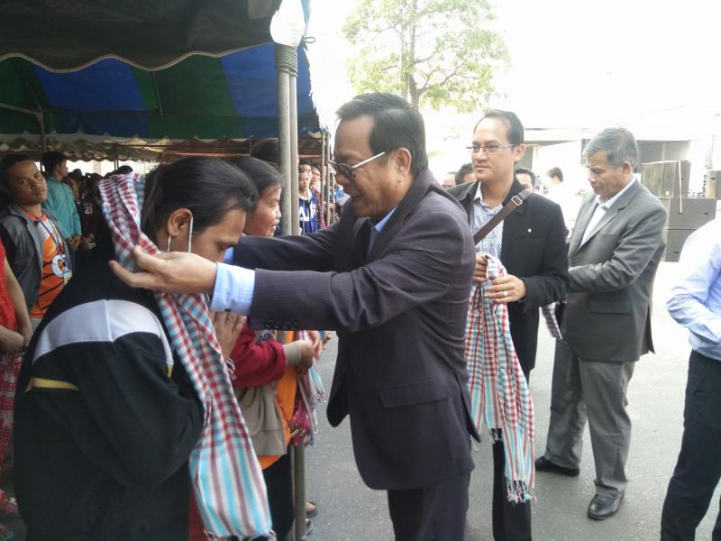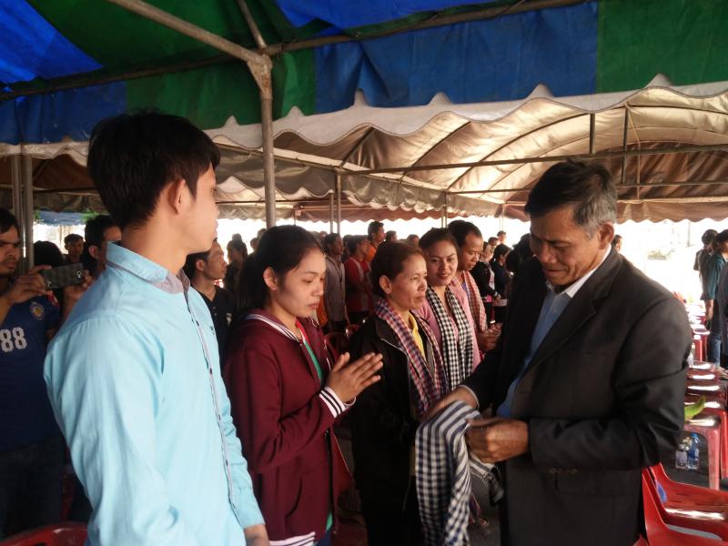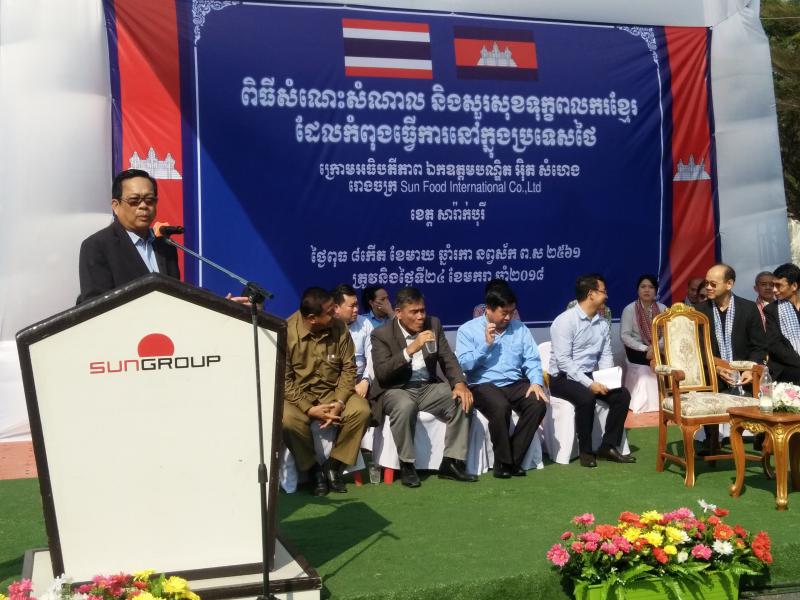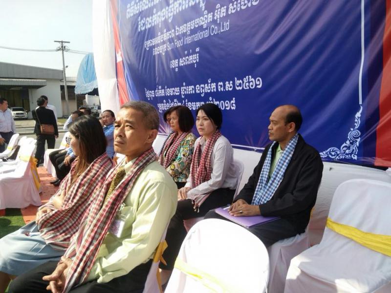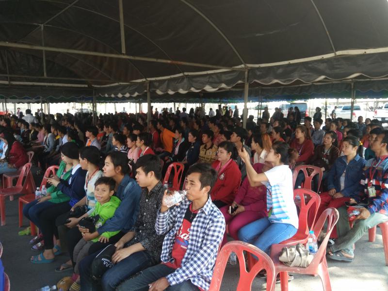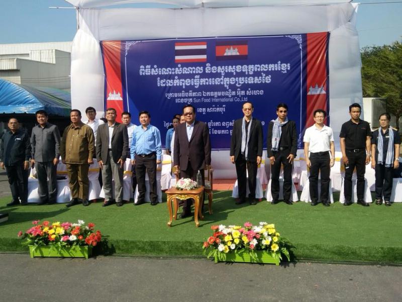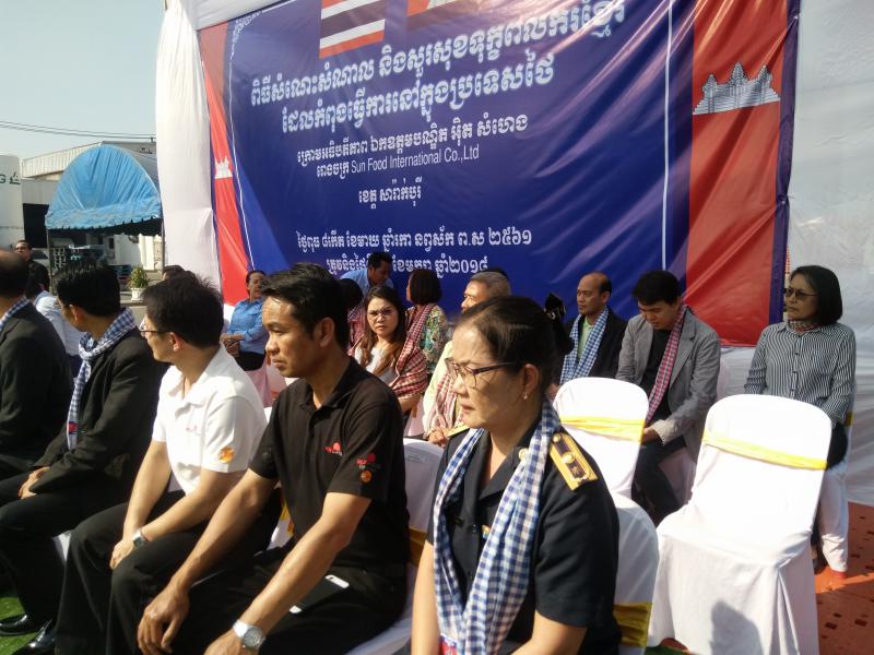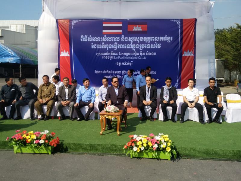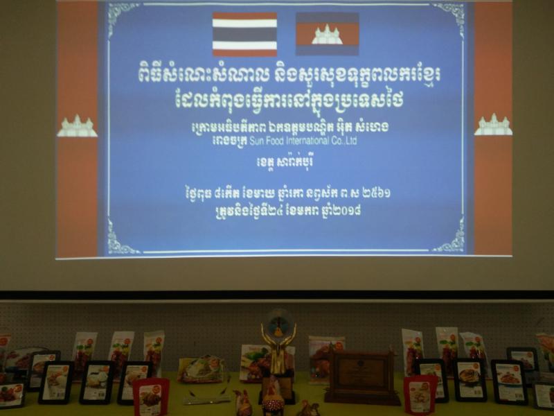 วันที่ 24 มกราคม 2561 เวลา 13.30 น. H.E. Mr. ITH SAMHENG รัฐมนตรีว่าการกระทรวงแรงงานและฝึกอาชีพกัมพูชา และคณะ เดินทางมาพบปะเยี่ยมเยียนแรงงานกัมพูชา 1,350 คน ณ บริษัท Sun Food International Co., Ltd. (บริษัท ซันฟู้ด อินเตอร์เนชั่นแนล จำกัด) ตั้งอยู่เลขที่ 69 หมู่ 6 ต.คำพราน อ.วังม่วง จ.สระบุรี ซึงบริษัท ซันฟู้ด อินเตอร์เนชั่นแนล จำกัด มีลูกจ้างทั้งสิ้นจำนวน 3,424 คน แบ่งเป็น สัญชาติไทย 1,863 คน แรงานสัญชาติกัมพูชา 1,350 คน สัญชาติลาว 177 คน ลูกจ้างคนพิการ 34 คน โดยมีนายอรรถพล ขันธวิธิ นักวิชาการแรงานชำนาญการ รักษาราชการแทนแรงงานจังหวัดสระบุรี พร้อมผู้แทนส่วนราชการสังกัดกระทรวงแรงงานจังหวัดสระบุรี ผู้บริหารบริษัท ซันฟู้ด อินเตอร์เนชั่นแนล จำกัด นายอำเภอวังม่วง และนางพรสุนีย์ คำพันธ์นายกเทศมนตรีตำบลคำพราน ให้การต้อนรับในครั้งนี้