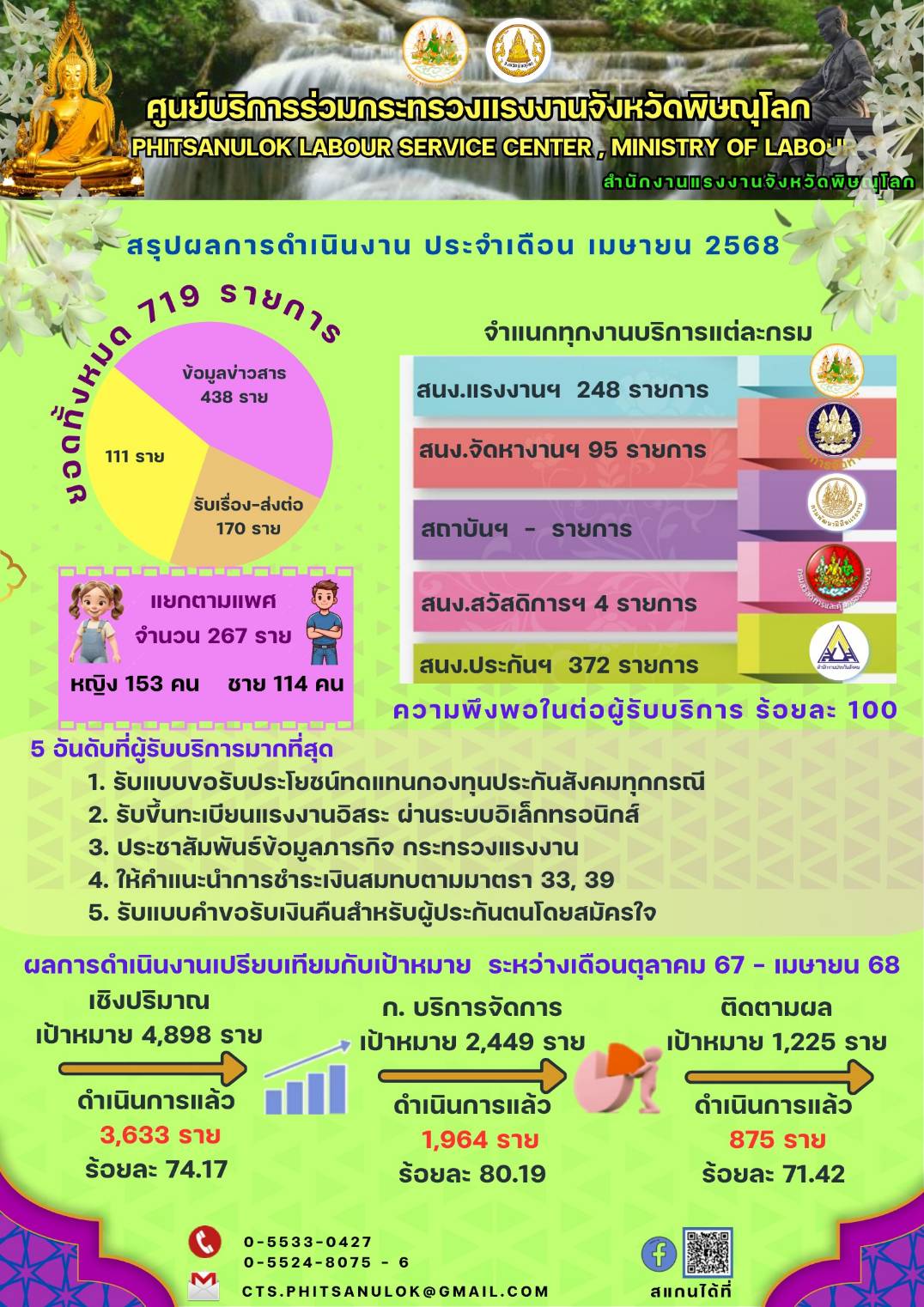 สรุปผลการดำเนินงานศูนย์บริการร่วมกระทรวงแรงงานจังหวัดพิษณุโลก ประจำเดือนเมษายน 2568