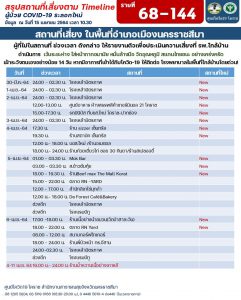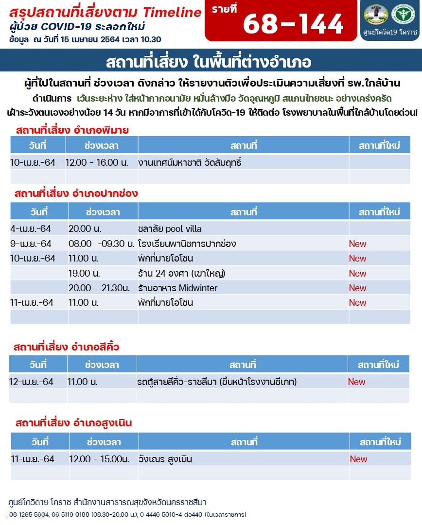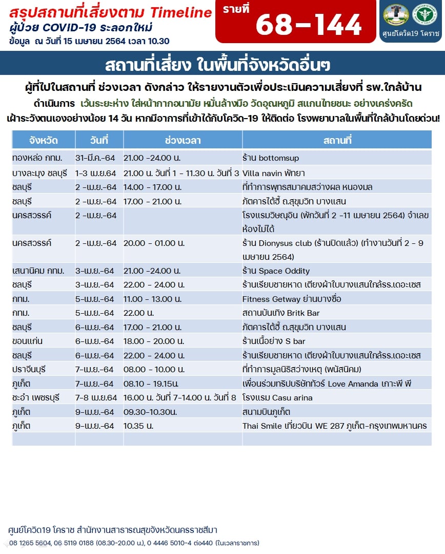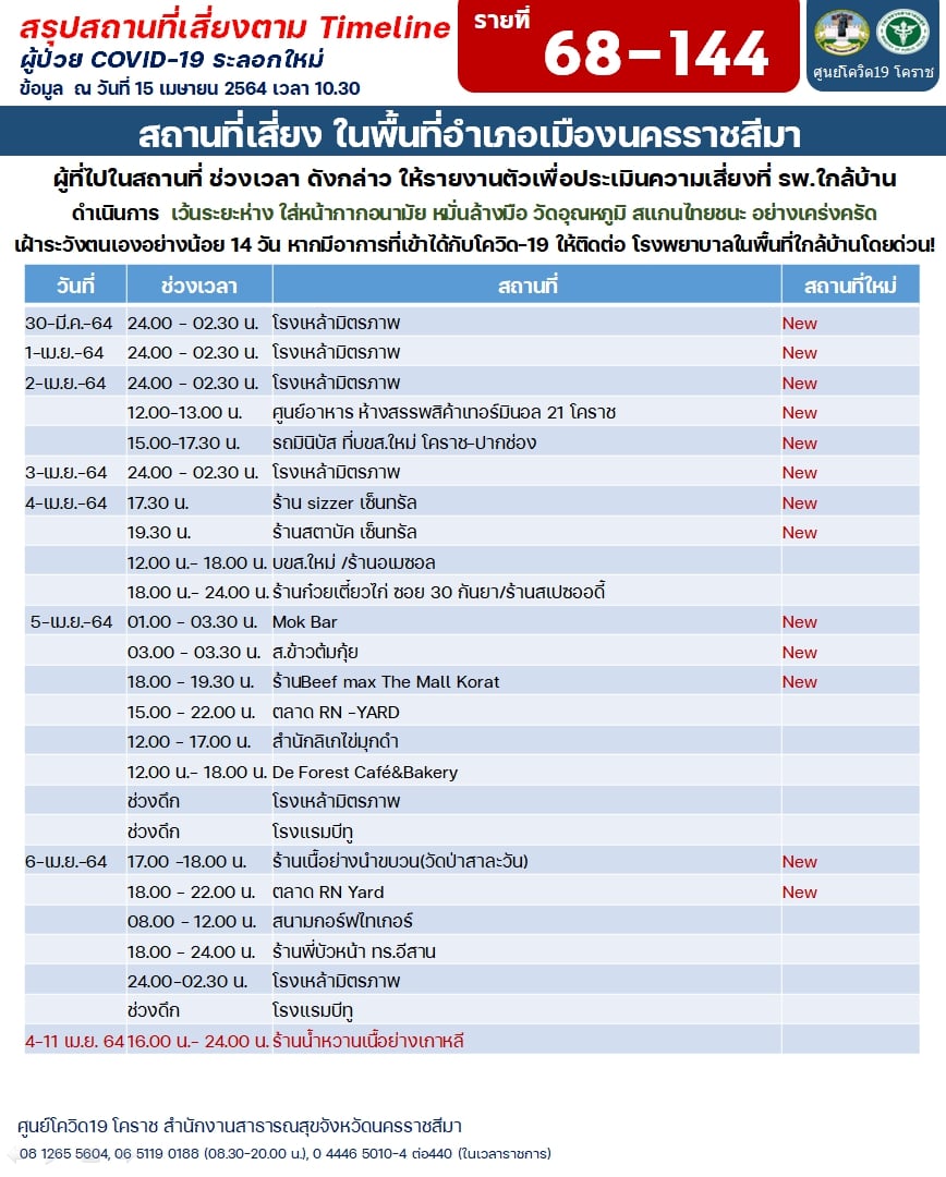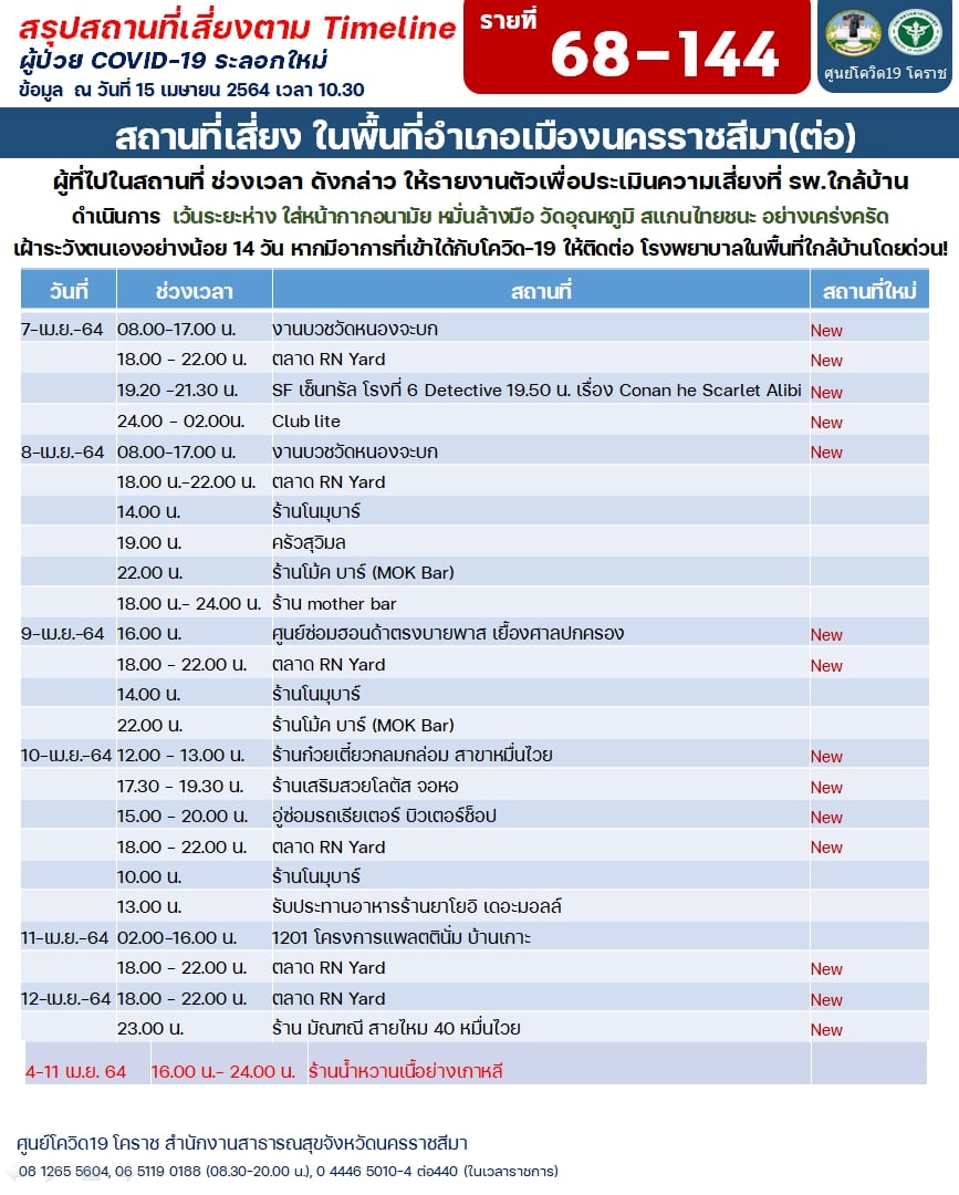 สรุปสถานที่เสี่ยงตาม Timeline ผู้ป่วย covid ระลอกใหม่เดือนเมษายน 2564 รายที่ 68 – 144 จังหวัดนครราชสีมา