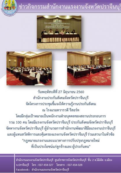 วันพฤหัสบดีที่ 27 มิถุนายน 2560สำนักงานประกันสังคมจังหวัดปราจีนบุรีจัดโครงการประชุมชี้แจงให้ความรู้งานประกันสังคม ณ โรงแรมทวารวดี รีสอร์ท