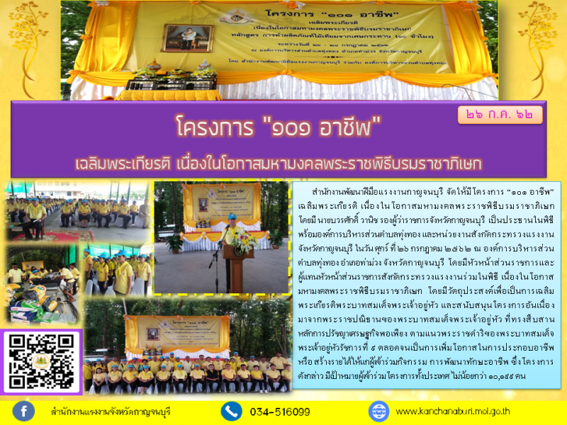 สำนักงานพัฒนาฝีมือแรงงานกาญจนบุรี จัดให้มี โครงการ “101 อาชีพ” เฉลิมพระเกียรติ เนื่องในโอกาสมหามงคลพระราชพิธีบรมราชาภิเษก