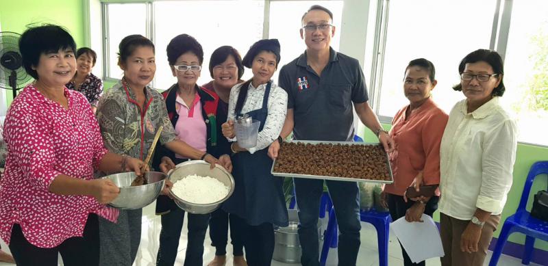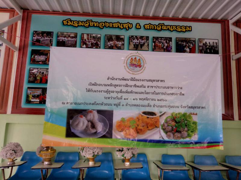 สำนักงานพัฒนาฝีมือแรงงานสมุทรสาคร เปิดฝึกอบรมหลักสูตรการฝึกอาชีพเสริม สาขาประกอบอาหารว่าง ให้กับแรงงานผู้สูงอายุเพื่อเพิ่มทักษะและโอกาสในการประกอบอาชีพ ระหว่างวันที่ 14 – 16 พฤศจิกายน 2560 ณ ศาลาอเนกประสงค์โคกหัวถนน หมู่ที่ 3 ตำบลคลองมะเดื่อ อำเภอกระทุ่มแบน จังหวัดสมุทรสาคร โดยอาสาสมัครแรงงานเป็นผู้ชี้เป้าผู้เข้าร่วมอบรม จำนวน 25 คน