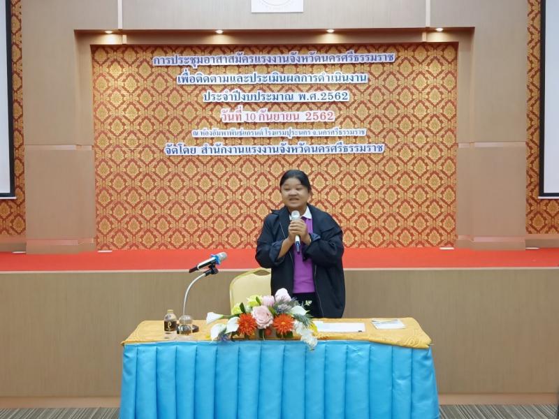 วันอังคารที่ 10 กันยายน 2562 เวลา 09.30 น. สำนักงานเเรงงานจังหวัดนครศรีธรรมราช ประชุมอาสาสมัครเเรงงานจังหวัดนครศรีธรรมราช เพื่อติดตามและประเมินผลการดำเนินงาน ประจำปีงบประมาณ พ.ศ.2562 ณ ห้องอัมพาพันธ์แกรนด์ โรงเเรมปุระนคร ถนนราชนิคม ตำบลท่าวัง อำเภอเมือง จังหวัดนครศรีธรรมราช