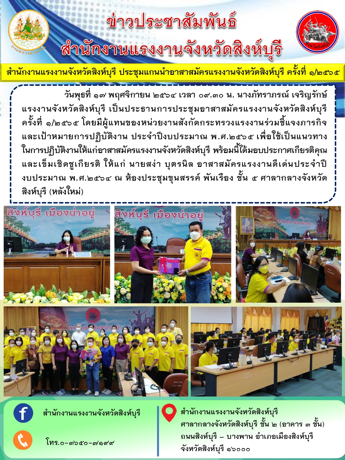 สำนักงานเเรงงานจังหวัดสิงห์บุรี ประชุมเเกนนำอาสาสมัครเเรงงานจังหวัดสิงห์บุรี ครั้งที่ 1/2565