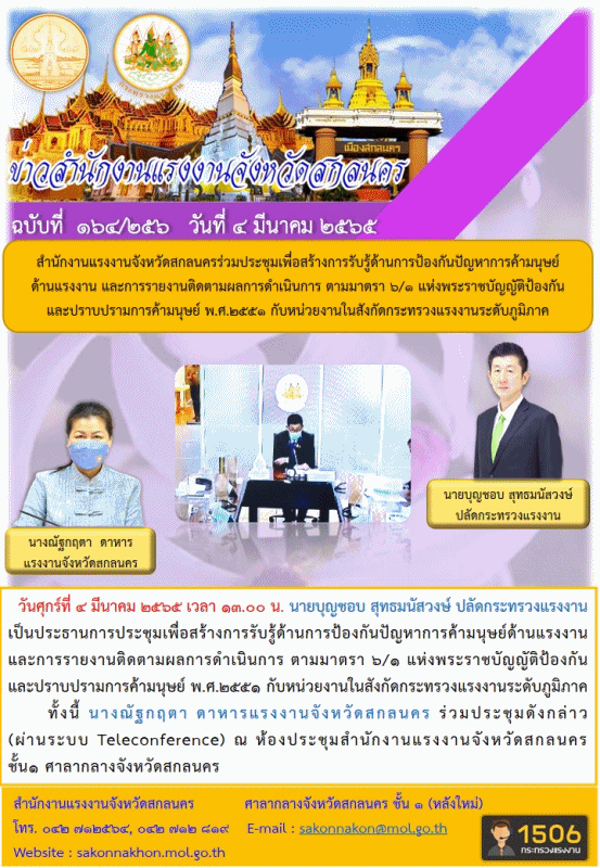 สำนักงานแรงงานจังสกลนครร่วมประชุมเพื่อสร้างการรับรู้ด้านการป้องกันปัญหาการค้ามนุษย์ด้านแรงงาน และการรายงานติดตามผลการดำเนินการ ตามมาตรา 6/1 แห่งพระราชบัญญัติปอ้งกันและปราบปรามการค้ามนุษย์ พ.ศ. 2551 กับหน่วยงานในสังกัดกระทรวงแรงงานระดับภูมิภาค