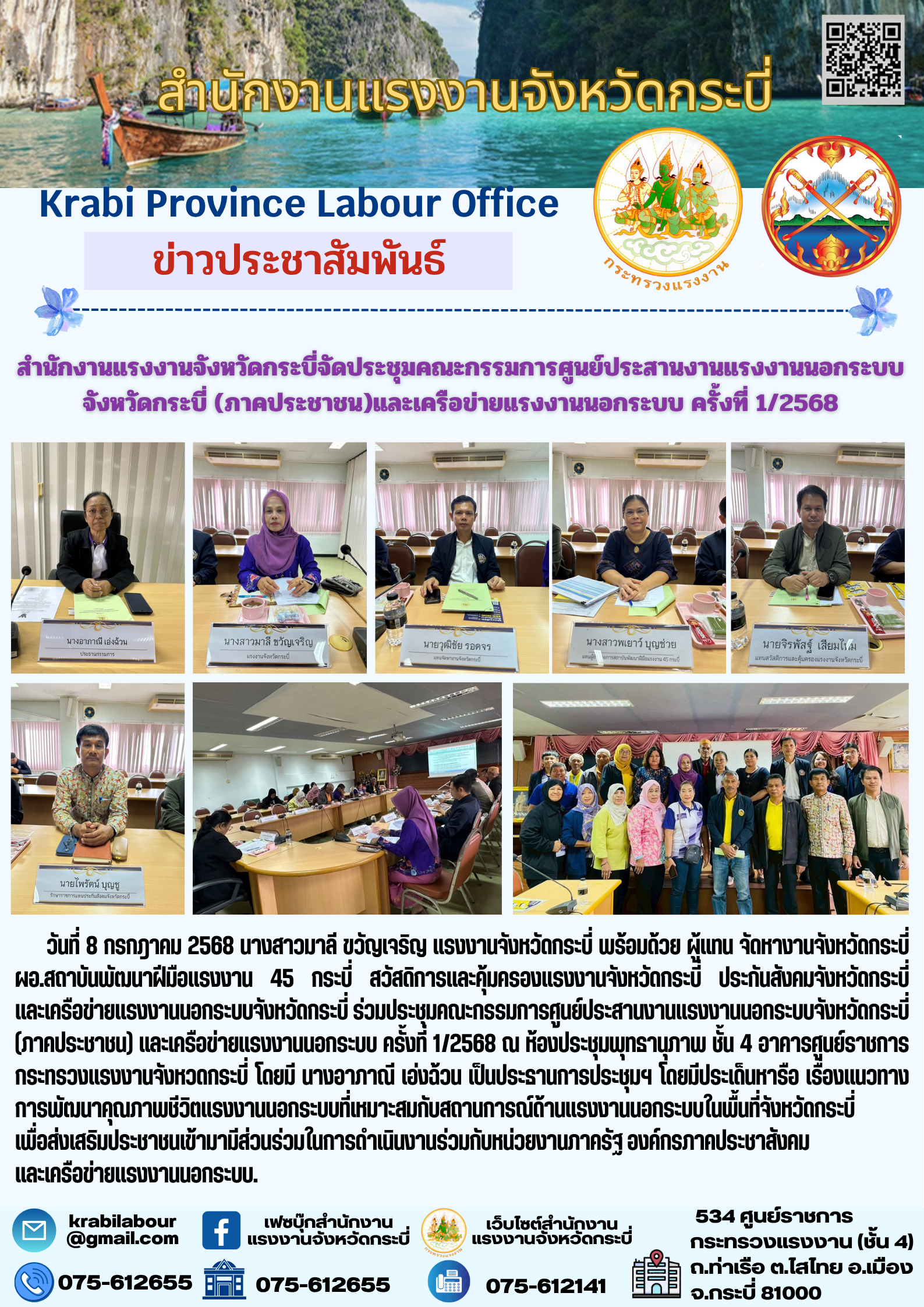 สำนักงานแรงงานจังหวัดกระบี่จัดประชุมคณะกรรมการศูนย์ประสานงานแรงงานนอกระบบจังหวัดกระบี่ (ภาคประชาชน)และเครือข่ายแรงงานนอกระบบ ครั้งที่ 1/2568