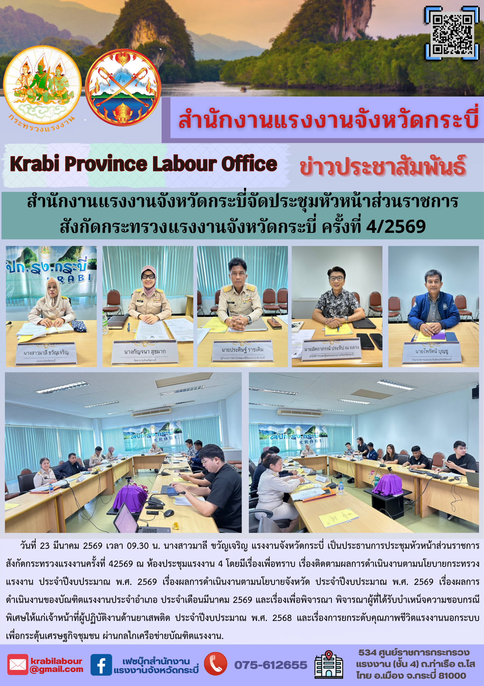 สำนักงานแรงงานจังหวัดกระบี่จัดประชุมหัวหน้าส่วนราชการ สังกัดกระทรวงแรงงานจังหวัดกระบี่ ครั้งที่ 4/2569
