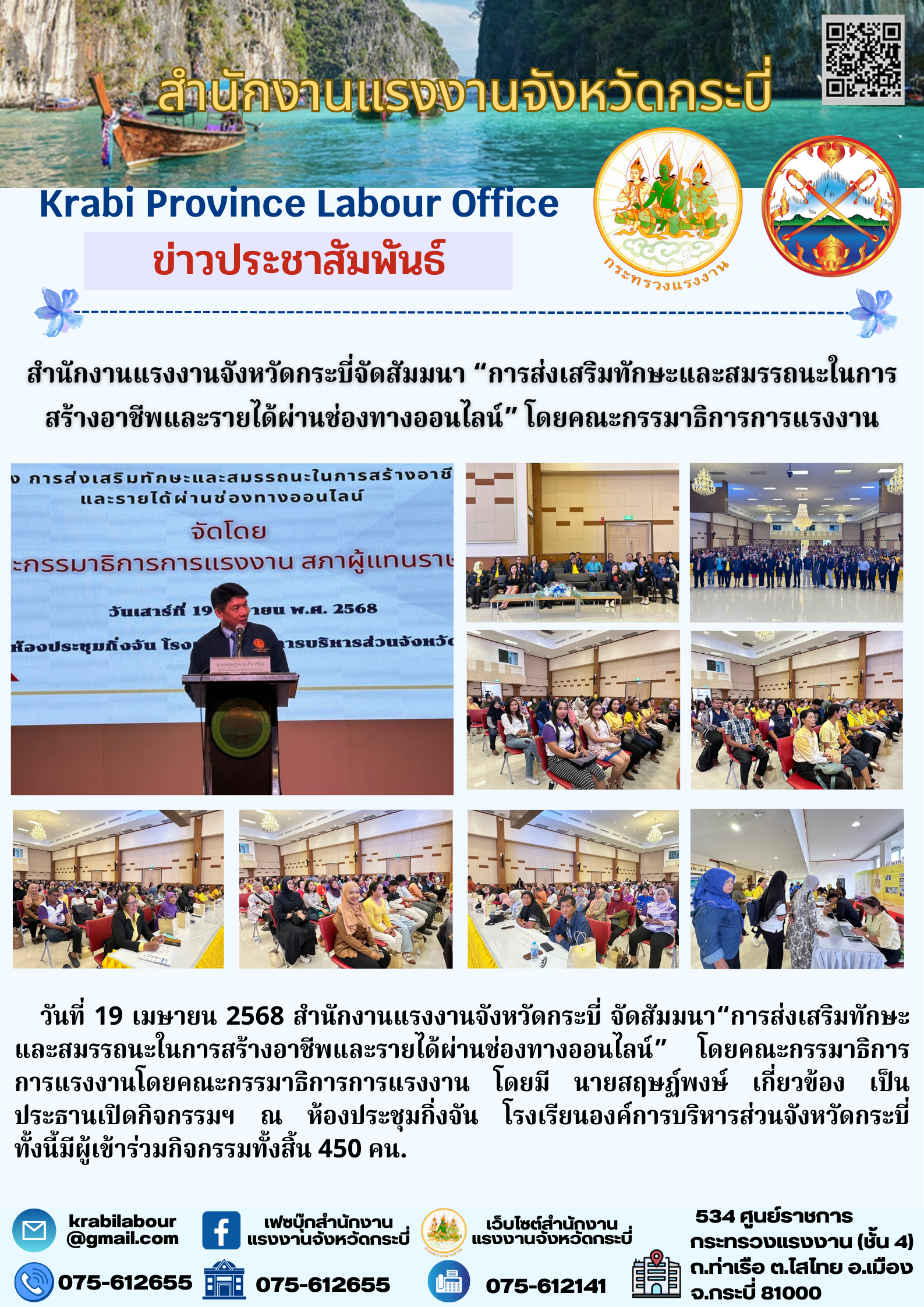 สำนักงานแรงงานจังหวัดกระบี่จัดสัมมนา “การส่งเสริมทักษะและสมรรถนะในการสร้างอาชีพและรายได้ผ่านช่องทางออนไลน์” โดยคณะกรรมาธิการการแรงงาน