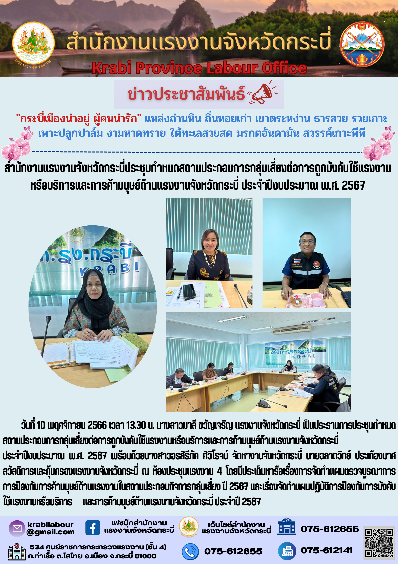 สรจ.กระบี่ ประชุมกำหนดสถานประกอบการกลุ่มเสี่ยงต่อการถูกบังคับใช้แรงงานหรือบริการและการค้ามนุษย์ด้านแรงงานจังหวัดกระบี่ ประจำปีงบประมาณ พ.ศ. 2567