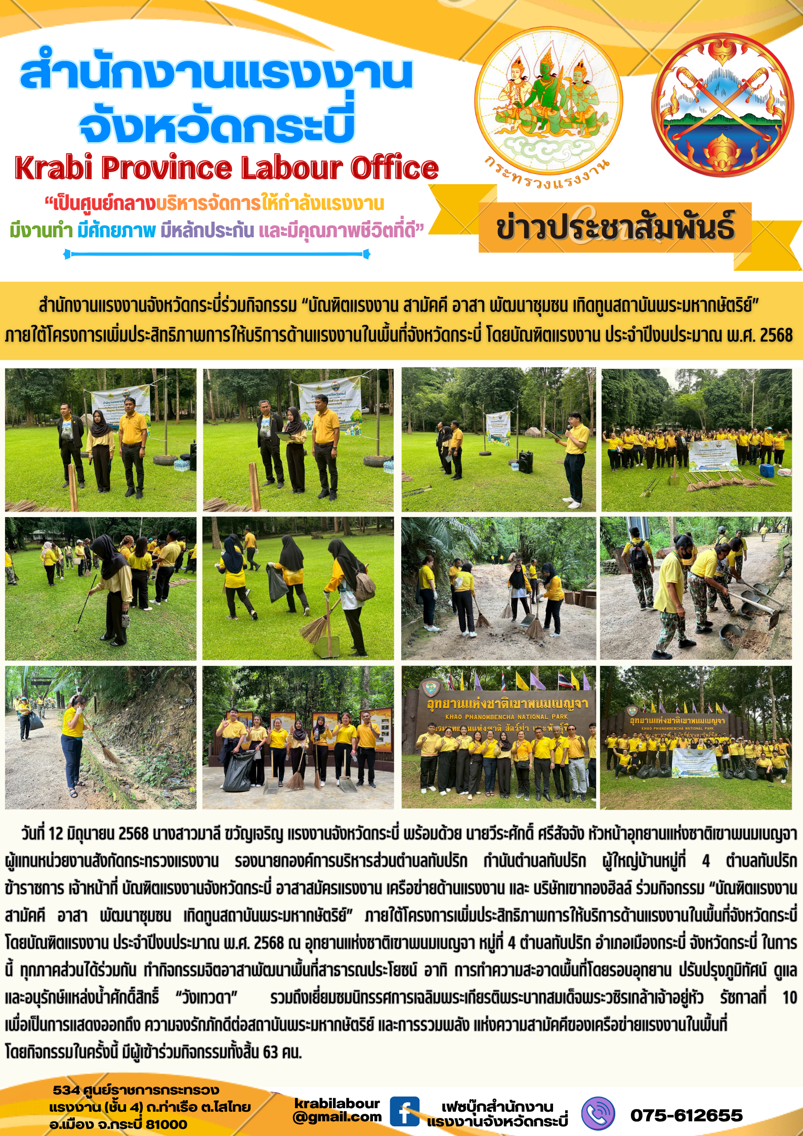 สำนักงานแรงงานจังหวัดกระบี่ร่วมกิจกรรม “บัณฑิตแรงงาน สามัคคี อาสา พัฒนาชุมชน เทิดทูนสถาบันพระมหากษัตริย์” ภายใต้โครงการเพิ่มประสิทธิภาพการให้บริการด้านแรงงานในพื้นที่จังหวัดกระบี่ โดยบัณฑิตแรงงาน ประจำปีงบประมาณ พ.ศ. 2568