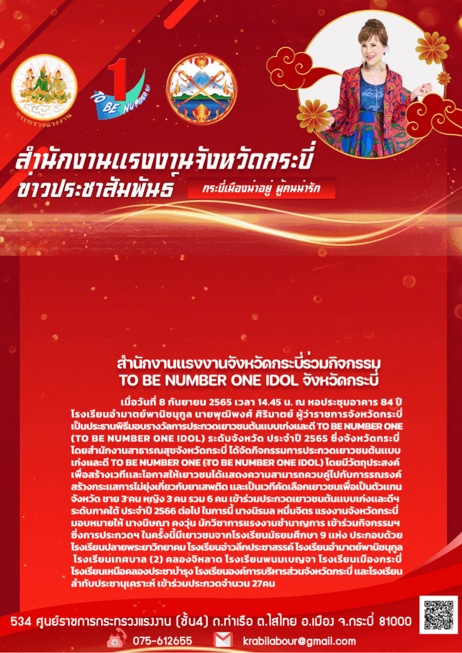 สำนักงานแรงงานจังหวัดกระบี่ร่วมกิจกรรม TO BE NUMBER ONE IDOL จังหวัดกระบี่
