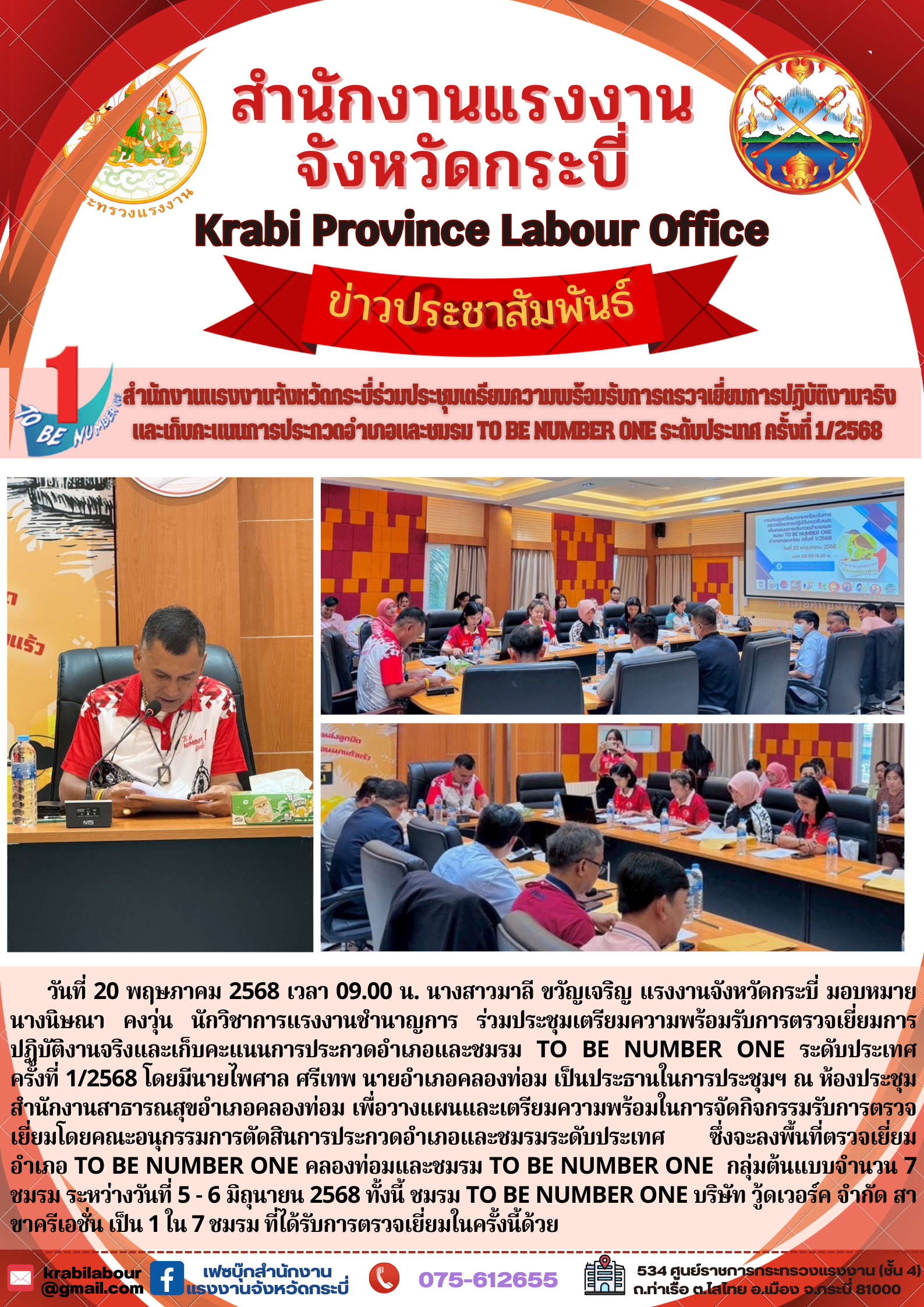 สำนักงานแรงงานจังหวัดกระบี่ร่วมประชุมเตรียมความพร้อมรับการตรวจเยี่ยมการปฏิบัติงานจริงและเก็บคะแนนการประกวดอำเภอและชมรม TO BE NUMBER ONE ระดับประเทศ ครั้งที่ 1/2568