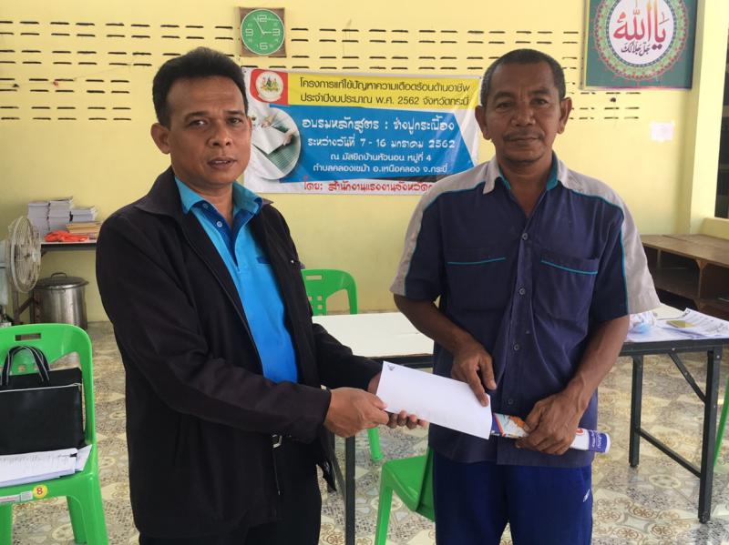 วันที่ ๑๖ มกราคม ๒๕๖๒ สำนักงานแรงงานจังหวัดกระบี่ ปิดกิจกรรมพัฒนาทักษะฝีมือ ตามโครงการแก้ไขปัญหาความเดือดร้อนด้านอาชีพ ประจำปีงบประมาณ พ.ศ.๒๕๖๒ จังหวัดกระบี่ จำนวน ๑ หลักสูตร ได้แก่ หลักสูตรช่างปูกระเบื้อง ณ มัสยิดบ้านหัวนอน ในพื้นที่ หมู่ที่ ๔ ตำบลคลองเขม้า อำเภอเหนือคลอง จังหวัดกระบี่ ผู้เข้าร่วมการฝึกอบรมในพื้นที่ได้รับการพัฒนาทักษะฝีมือ จำนวน ๒๐ คน