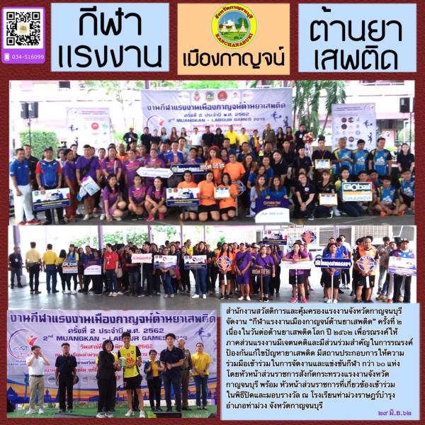 กีฬา ‘ต้าน’ ยาเสพติดสำนักงานสวัสดิการและคุ้มครองแรงงานจังหวัดกาญจนบุรี โดยนายประภาส ศิลปรัศมี สวัสดิการและคุ้มครองแรงงานจังหวัดกาญจนบุรีจัดงาน “กีฬาแรงงานเมืองกาญจน์ต้านยาเสพติด” ครั้งที่ ๒ โดยผู้ว่าราชการจังหวัดกาญจนบุรี มอบให้นางสุขุมาล ธนานันต์ แรงงานจังหวัดกาญจนบุรี เป็นประธานเปิดงานเนื่องในวันต่อต้านยาเสพติดโลก ปี ๒๕๖๒ เพื่อรณรงค์ให้ภาคส่วนแรงงานมีเจตนคติและมีส่วนร่วมสำคัญในการป้องกันแก้ไขปัญหายาเสพติด มีสถานประกอบการให้ความร่วมมือเข้าร่วมในการจัดงานและแข่งขันกีฬา กว่า ๖๐ แห่ง โดยหัวหน้าส่วนราชการสังกัดกระทรวงแรงงานจังหวัดกาญจนบุรีพร้อม หัวหน้าส่วนราชการที่เกี่ยวข้องเข้าร่วมในพิธีปิดและมอบรางวัล ณ โรงเรียนท่าม่วงราษฎร์บำรุง อำเภอท่าม่วง จังหวัดกาญจนบุรี