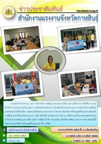 สำนักงานแรงงานจังหวัดกาฬสินธุ์ พร้อมด้วยหน่วยงานที่เกี่ยวข้อง ตรวจสถานประกอบการ โครงการป้องกันการค้ามนุษย์ด้านแรงงานจังหวัดกาฬสินธุ์ ประจำปีงบประมาณ พ.ศ.2562 เมื่อวันที่ 24 มิถุนายน 2562