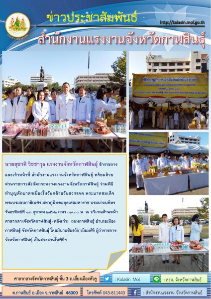 สำนักงานแรงงานจังหวัดกาฬสินธุ์ ร่วมพิธีทำบุญตักบาตรเนื่องในวันคล้ายวันสวรรคต พระบาทสมเด็จพระบรมชนกาธิเบศร มหาภูมิพลอดุยเดชมหาราช บรมนาถบพิตร วันที่ 13 ตุลาคม 2562 ณ บริเวณด้านหน้าศาลากลางจังหวัดกาฬสินธุ์ (หลังเก่า) อำเภอเมือง จังหวัดกาฬสินธุ์