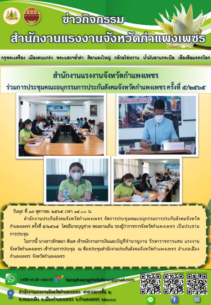 สำนักงานแรงงานจังหวัดกำแพงเพชร ร่วมการประชุมคณะอนุกรรมการประกันสังคมจังหวัดกำแพงเพชร ครั้งที่ 5/2565