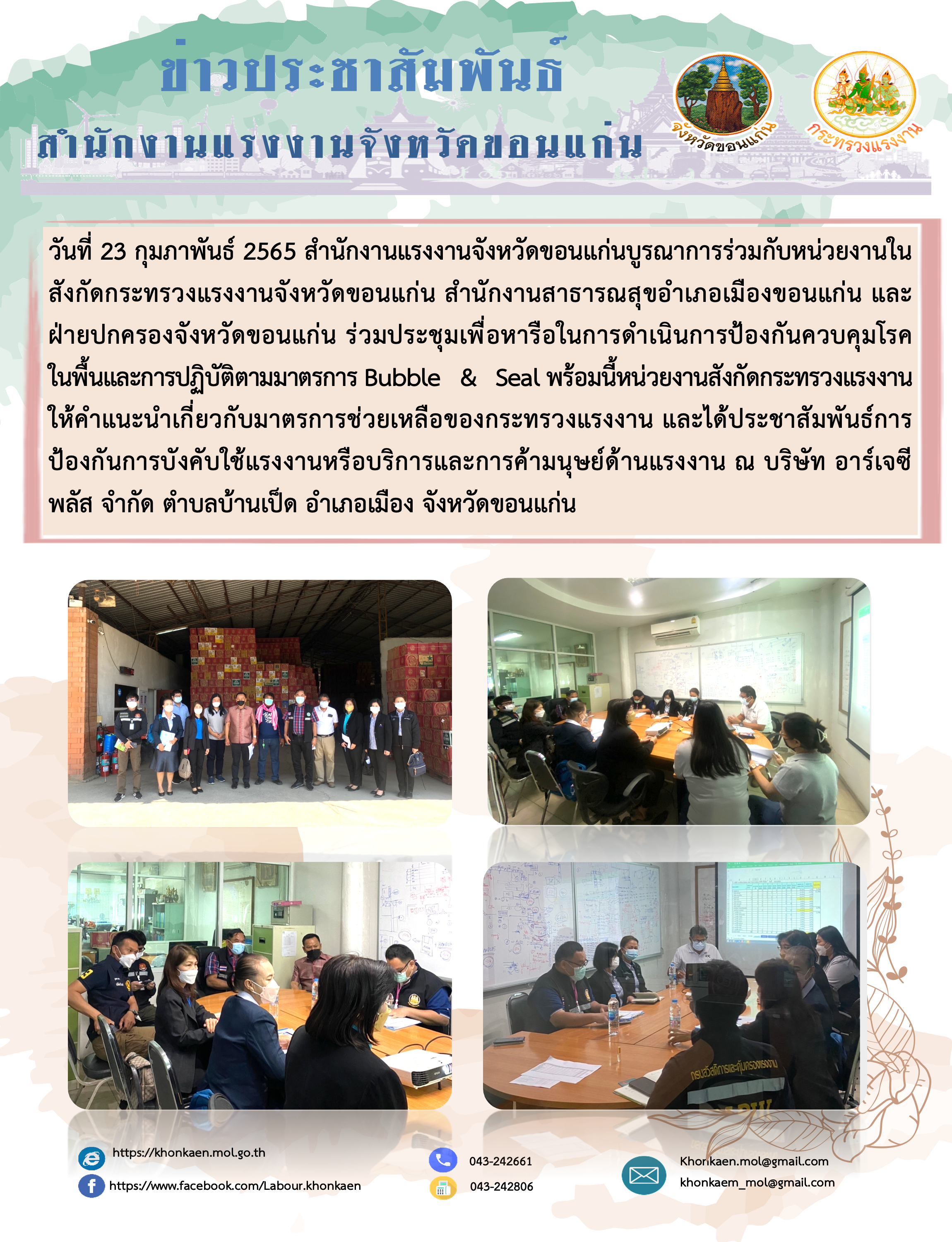สำนักงานแรงงานจังหวัดขอนแก่นร่วมประชุมเพื่อหารือในการดำเนินการป้องกันควบคุมโรคในพื้นและการปฏิบัติตามมาตรการ Bubble & Seal ณ บริษัท อาร์เจซี พลัส จำกัด