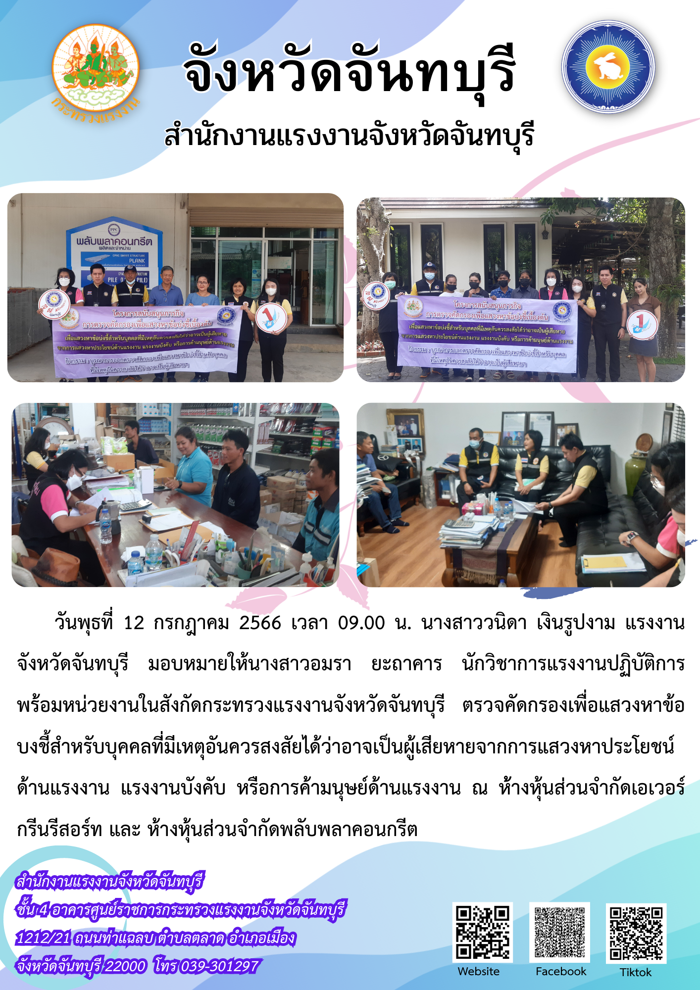 สรจ.จันทบุรี ตรวจคัดกรองเพื่อแสวงหาข้อบงชี้สำหรับบุคคลที่่มีเหตุอันควรสงสัยได้ว่าอาจเป็นผู้เสียหายจากการแสวงหาประโยชน์ด้านแรงงาน แรงงานบังคับ หรือการค้ามนุษย์ด้านแรงงาน