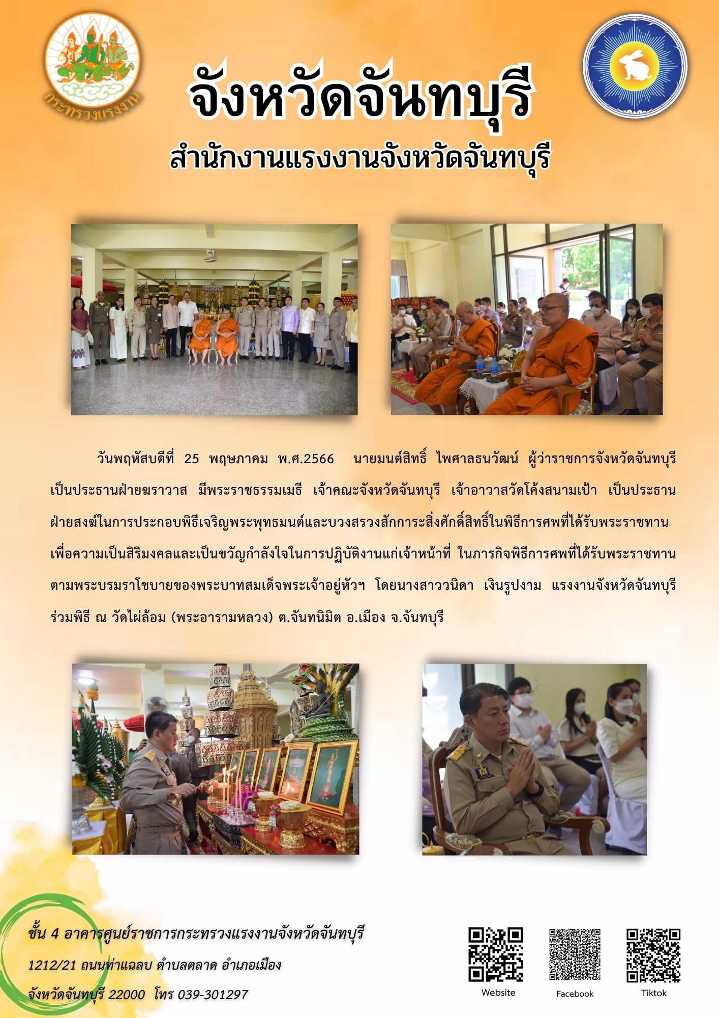 สรจ.จันทบุรี ร่วมพิธีเจริญพระพุทธมนต์และบวงสรวงสักการะสิ่งศักดิ์สิทธิ์ในพิธีการศพที่ได้รับพระราชทาน เพื่อความเป็นสิริมงคลและเป็นขวัญกำลังใจในการปฏิบัติงานแก่เจ้าหน้าที่ ในภารกิจพิธีการศพที่ได้รับพระราชทานตามพระบรมราโชบายของพระบาทสมเด็จพระเจ้าอยู่หัวฯ