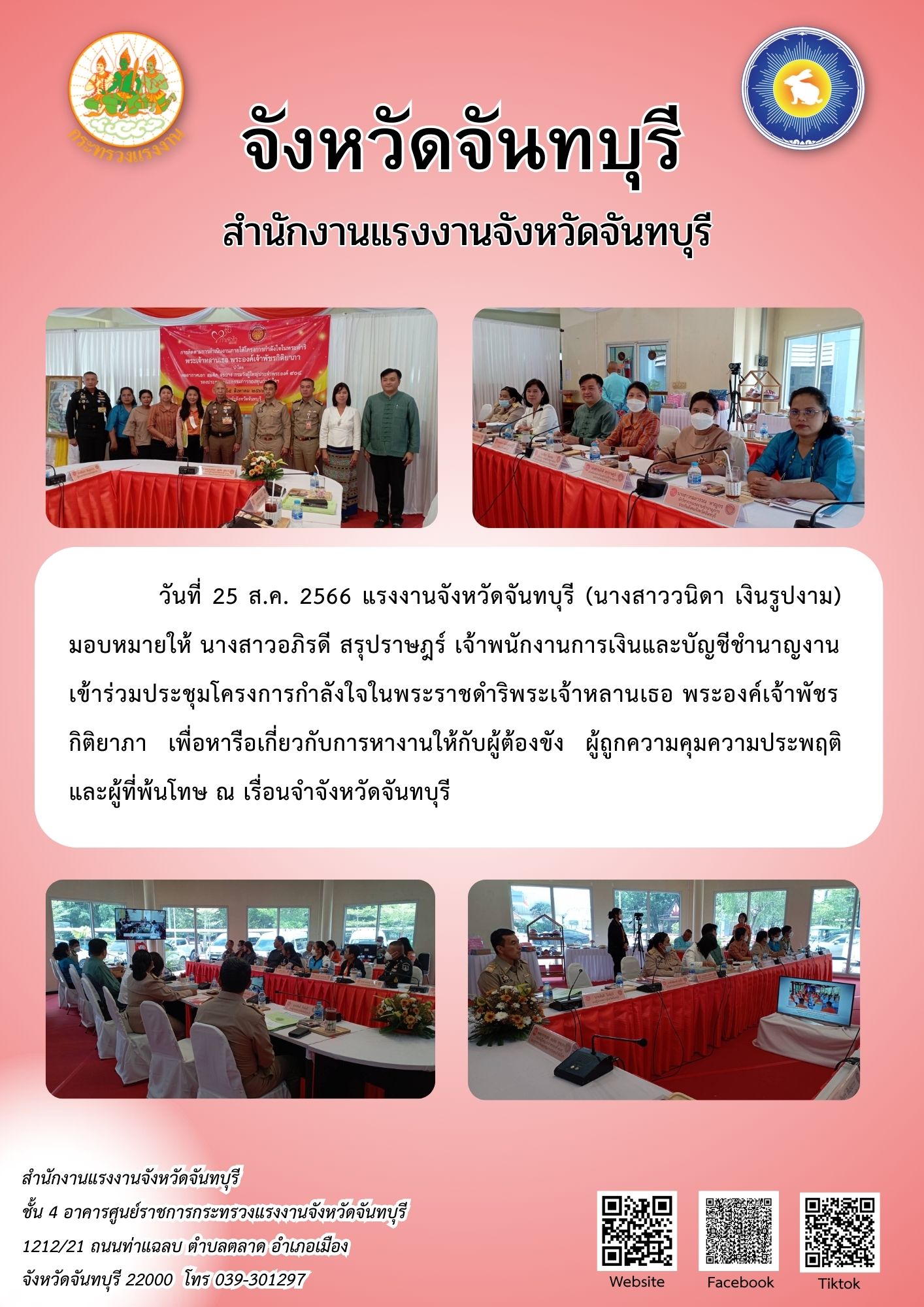 สรจ.จันทบุรี ร่วมประชุมโครงการกำลังใจในพระราชดำริพระเจ้าหลานเธอ พระองค์เจ้าพัชร กิติยาภา เพื่อหารือเกี่ยวกับการหางานให้กับผู้ต้องขัง ผู้ถูกความคุมความประพฤติและผู้ที่พ้นโทษ