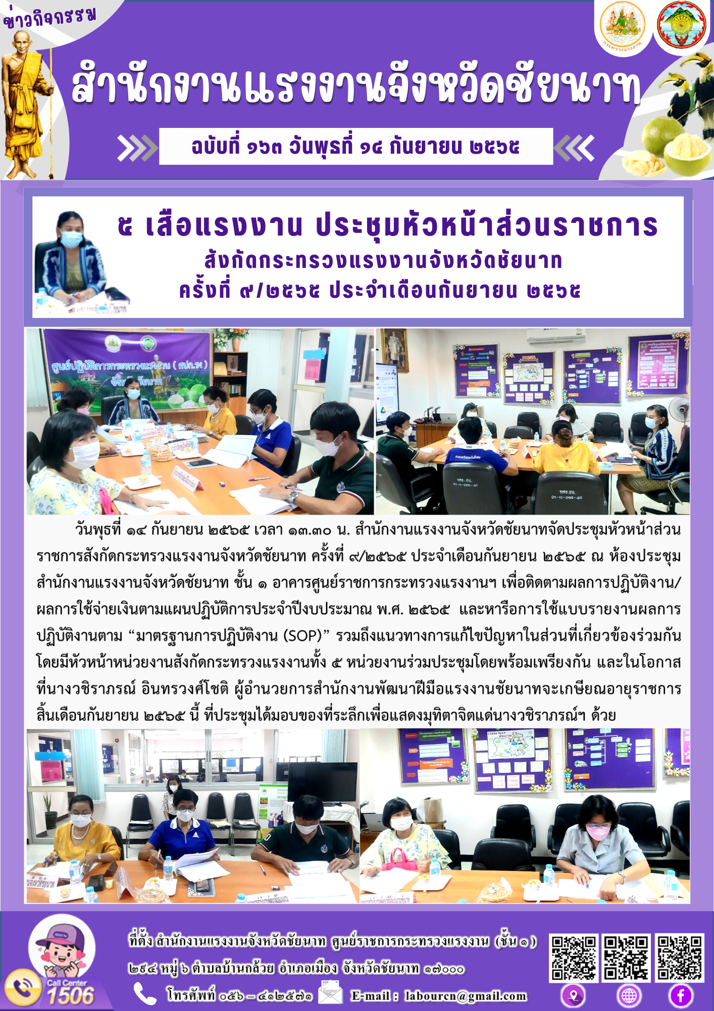 สำนักงานแรงงานจังหวัดชัยนาทจัดประชุมหัวหน้าส่วนราชการสังกัดกระทรวงแรงงานจังหวัดชัยนาท ครั้งที่ 9/2565 ประจำเดือนกันยายน 2565