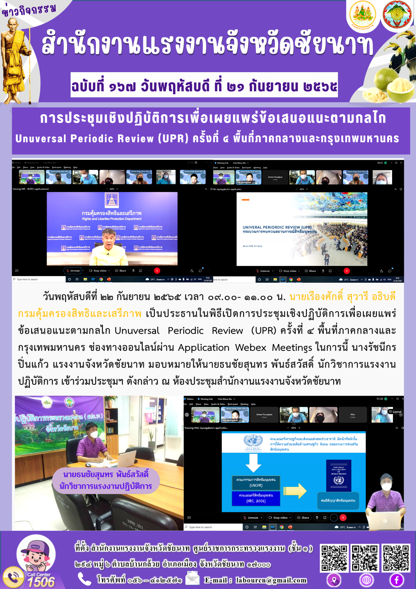 สำนักงานแรงงานจังหวัดชัยนาท ร่วมการประชุมเชิงปฏิบัติการเพื่อเผยแพร่ข้อเสนอแนะตามกลไก Unuversal Periodic Review (UPR) ครั้งที่ 4 พื้นที่ภาคกลางและกรุงเทพมหานคร