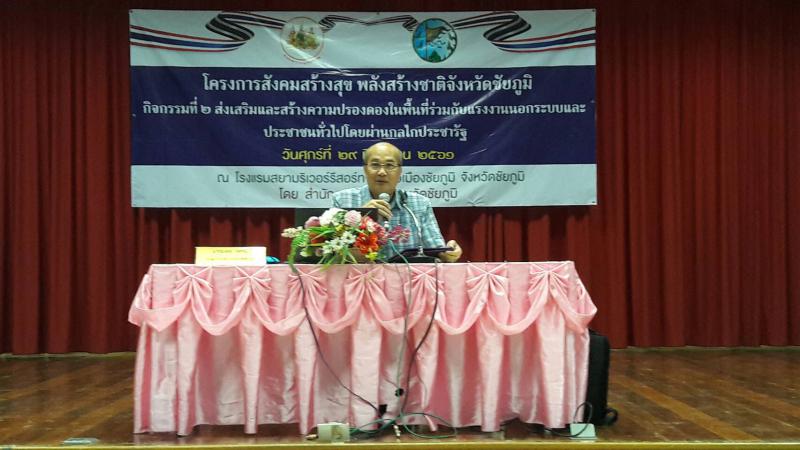 วันศุกร์ที่ 29 มิ.ย.2561 น.ส.อิสรี วีรกุลพิพัฒน์ แรงงานจังหวัดชัยภูมิ จัดสัมมนาโครงการสังคมสร้างสุข พลังสร้างชาติ จ.ชัยภูมิ กิจกรรมที่ 2 ส่งเสริมและสร้างความปรองดองในพื้นที่ร่วมกับแรงงานนอกระบบและประชาชนทั่วไปโดยผ่านกลไกประชารัฐ ณ ห้องแกรนด์บอลรูม รร.สยามริเวอร์รีสอร์ท จ.ชัยภูมิ โดยนายมงคล อดทน รองผู้ว่าราชการจังหวัดชัยภูมิ ให้เกียรติเป็นประธานในพิธีเปิด ผู้เข้าร่วมโครงการประกอบด้วยแรงงานนอกระบบที่ผ่านการพัฒนาทักษะอาชีพในกิจกรรมที่ 1 และอาสาสมัครแรงงานประจำตำบล จ.ชัยภูมิ รวมทั้งสิ้น 244 คน