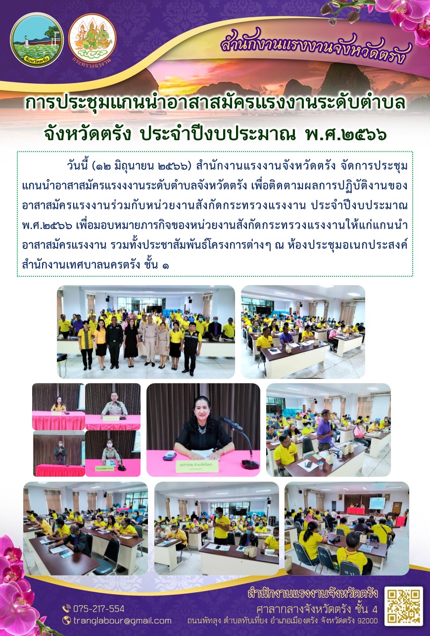 สรจ.ตรัง จัดการประชุมแกนนำอาสาสมัครแรงงงานระดับตำบลจังหวัดตรัง เพื่อติดตามผลการปฏิบัติงานของอาสาสมัครแรงงานร่วมกับหน่วยงานสังกัดกระทรวงแรงงาน ประจำปีงบประมาณ พ.ศ. 2566