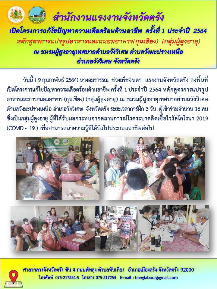 สำนักงานแรงงานจังหวัดตรัง เปิดโครงการแก้ไขปัญหาความเดือดร้อนด้านอาชีพ ครั้งที่ 1 ประจำปี 2564 หลักสูตรการแปรรูปอาหารและถนอมอาหาร(กุนเชียง) (กลุ่มผู้สูงอายุ) ณ ชมรมผู้สูงอายุเทศบาลตำบลวังวิเศษ ตำบลวังมะปรางเหนือ อำเภอวังวิเศษ จังหวัดตรัง