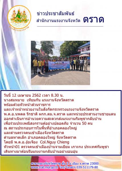 สำนักงานแรงงานจังหวัดตราด ร่วมกับหัวหน้าส่วนราชการสังกัดกระทรวงแรงงานจังหวัดตราด ออกดำเนินการอำนวยความสะดวกส่งแรงงานกัมพูชากลับบ้านเพื่อร่วมประเพณีสงกรานต์อย่างปลอดภัย