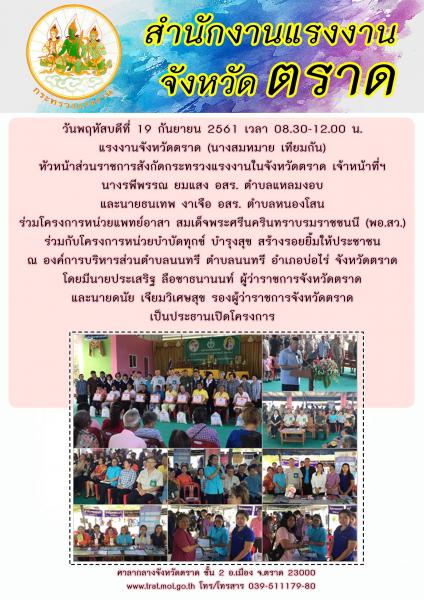สำนักงานแรงงานจังหวัดตราด ร่วมโครงการหน่วยแพทย์อาสา สมเด็จพระศรีนครินทราบรมราชชนนี (พอ.สว.) ร่วมกับโครงการหน่วยบำบัดทุกข์ บำรุงสุข สร้างรอยยิ้มให้ประชาชน