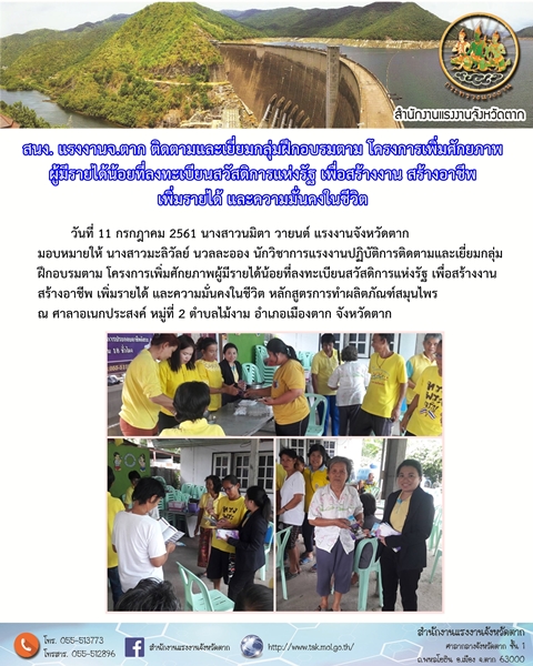 สำนักงานแรงงานจังหวัดตาก ติดตามและเยี่ยมกลุ่มฝึกอบรมตาม โครงการเพิ่มศักยภาพผู้มีรายได้น้อยที่ลงทะเบียนสวัสดิการแห่งรัฐ เพื่อสร้างงาน สร้างอาชีพ เพิ่มรายได้ และความมั่นคงในชีวิต