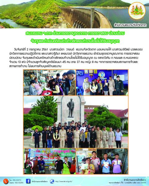 สำนักงานแรงงานจังหวัดตาก ร่วมการตรวจบูรณาการ การตรวจสอบ ปราบปราม จับกุมและดำเนินคดีคนต่างด้าวลักลอกทำงานโดยมิได้อนุญาต