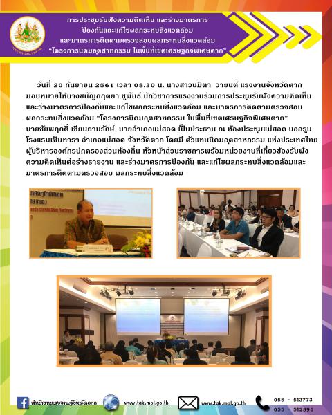 สำนักงานแรงงานจังหวัดตาก ร่วมการประชุมรับฟังความคิดเห็น และร่างมาตรการป้องกันและแก้ไขผลกระทบสิ่งแวดล้อม และมาตรการติดตามตรวจสอบผลกระทบสิ่งแวดล้อม “โครงการนิคมอุตสาหกรรม ในพื้นที่เขตเศรษฐกิจพิเศษตาก”