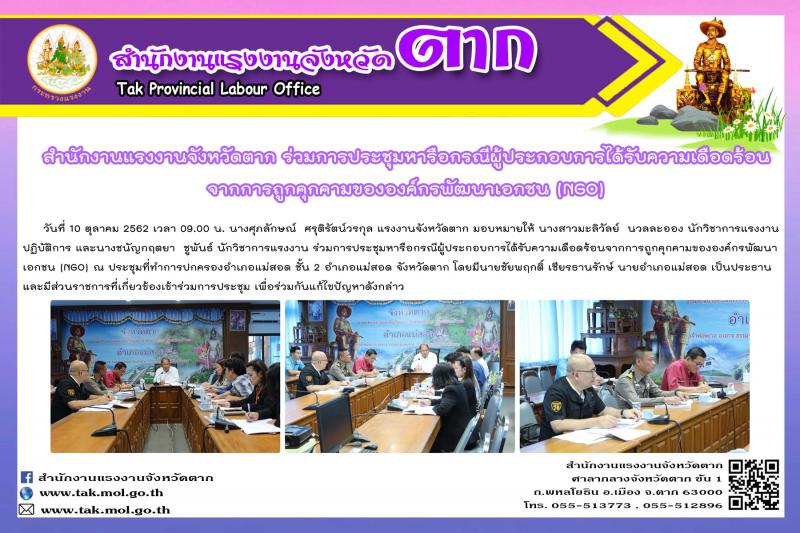 สำนักงานแรงงานจังหวัดตาก ร่วมการประชุมหารือกรณีผู้ประกอบการได้รับความเดือดร้อน จากการถูกคุกคามขององค์กรพัฒนาเอกชน (NGO)