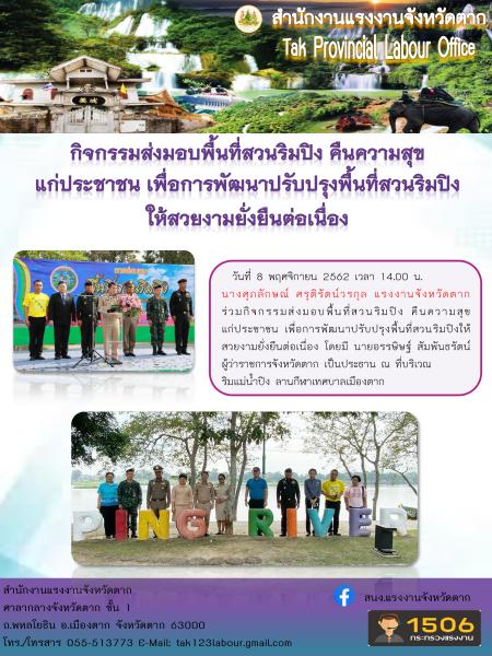 สำนักงานแรงงานจังหวัดตาก ร่วมกิจกรรมส่งมอบพื้นที่สวนริมปิง คืนความสุข แก่ประชาชน เพื่อการพัฒนาปรับปรุงพื้นที่สวนริมปิงให้สวยงามยั่งยืนต่อเนื่อง