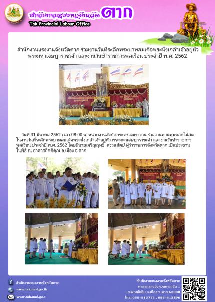 สำนักงานแรงงานจังหวัดตาก ร่วมงานวันที่ระลึกพระบาทสมเด็จพระนั่งเกล้าเจ้าอยู่หัว พระมหาเจษฎาราชเจ้า และงานวันข้าราชการพลเรือน ประจำปี พ.ศ. 2562