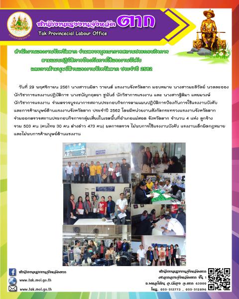 สำนักงานแรงงานจังหวัดตาก ร่วมตรวจบูรณาการสถานประกอบกิจการตามแผนปฏิบัติการป้องกันการใช้แรงงานบังคับและการค้ามนุษย์ด้านแรงงานจังหวัดตาก ประจำปี 2562